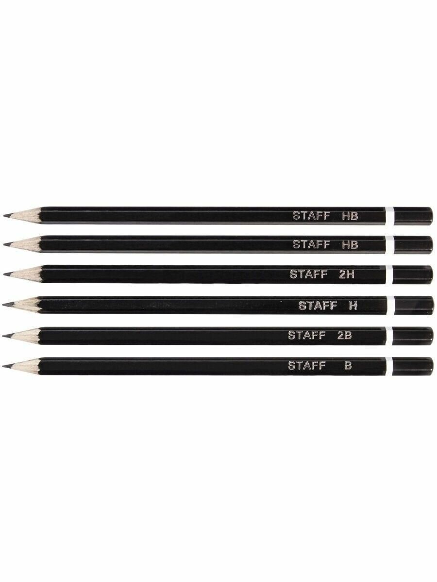 Купить Карандаши чернографитные Staff 2H-2B, набор 6 штук, черный корпус, без резинки, заточенные (181254)