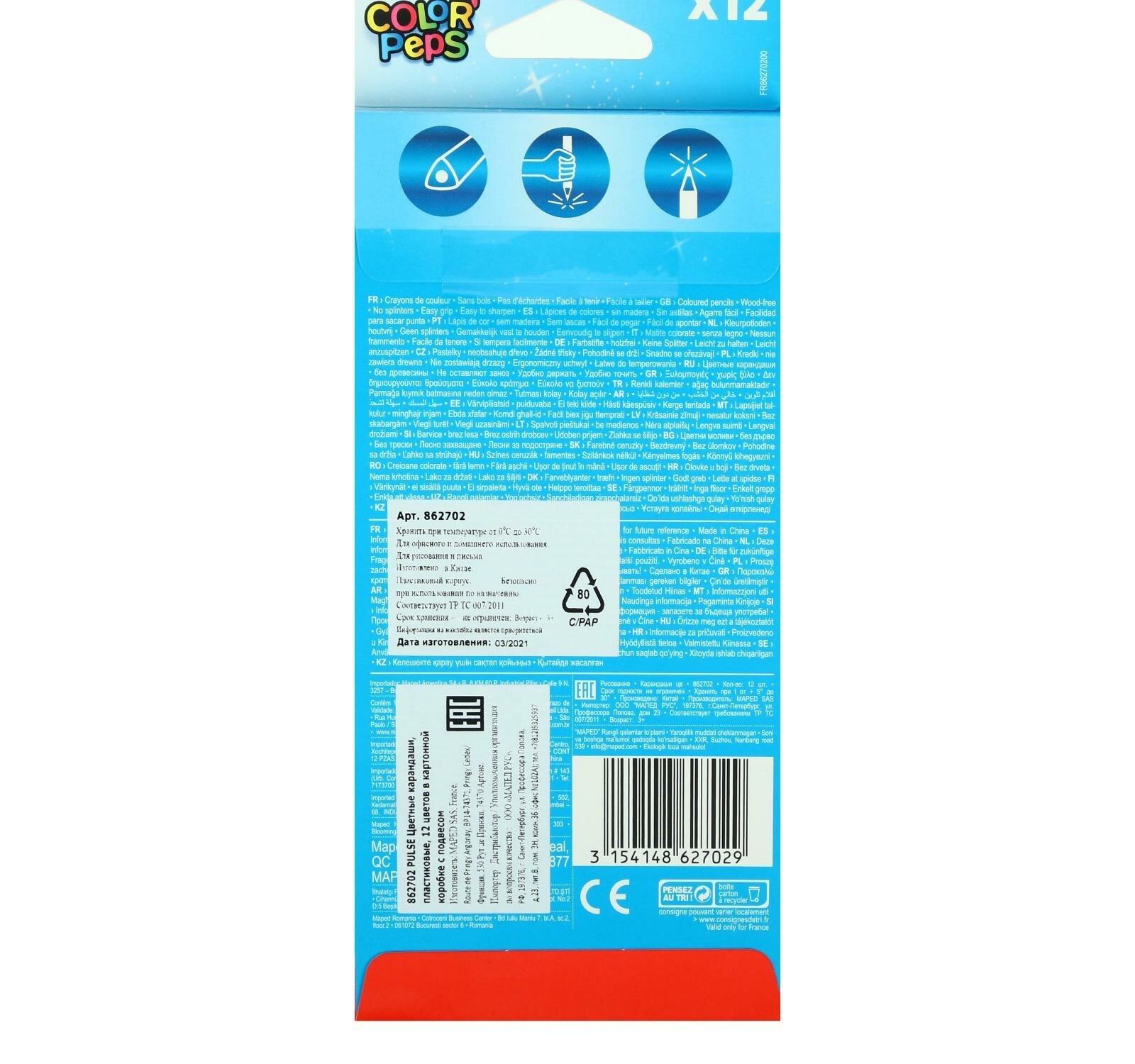 Карандаши пластиковые 12 цветов, Maped Pulse, трёхгранные (1 шт.)