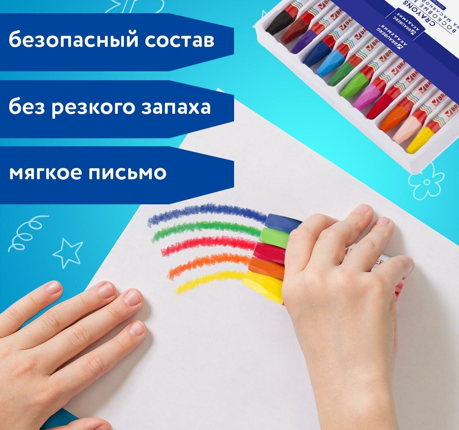 Восковые мелки утолщенные BRAUBERG "академия" набор 12 цветов на масляной основе яркие цвета, 6 шт