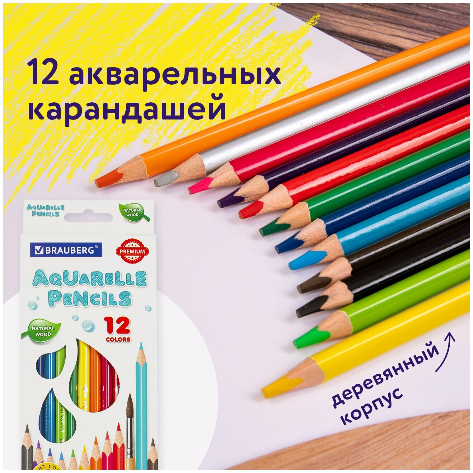 Карандаши цветные Brauberg акварельные, Premium aquarelle, 12 цветов, грифель мягкий, 4 мм (181671), 1 упак.