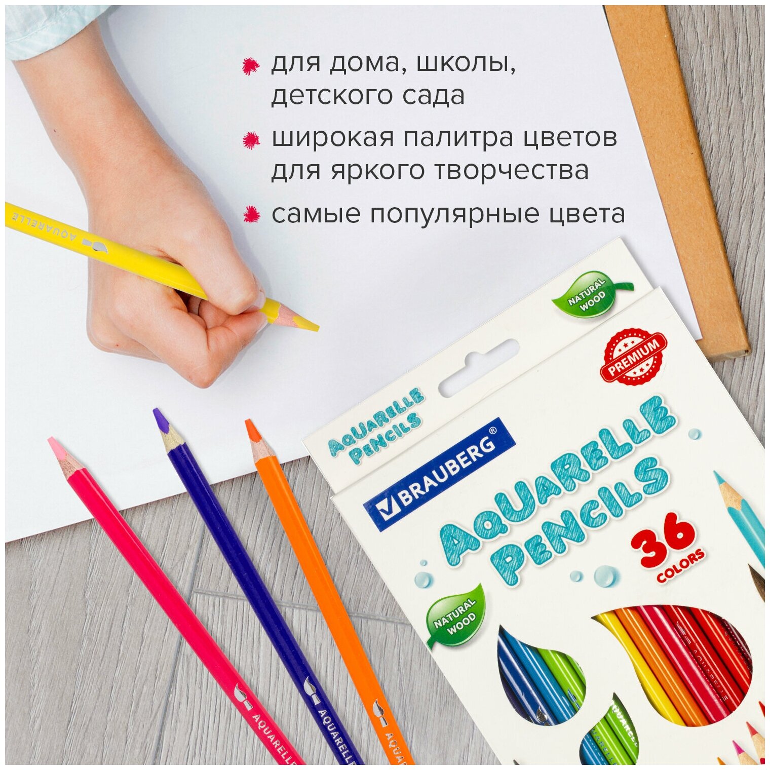 Карандаши цветные акварельные Brauberg Premium Aquarelle, 36 цветов, трехгранные, утолщенный грифель 4 мм, натуральное дерево, 181674