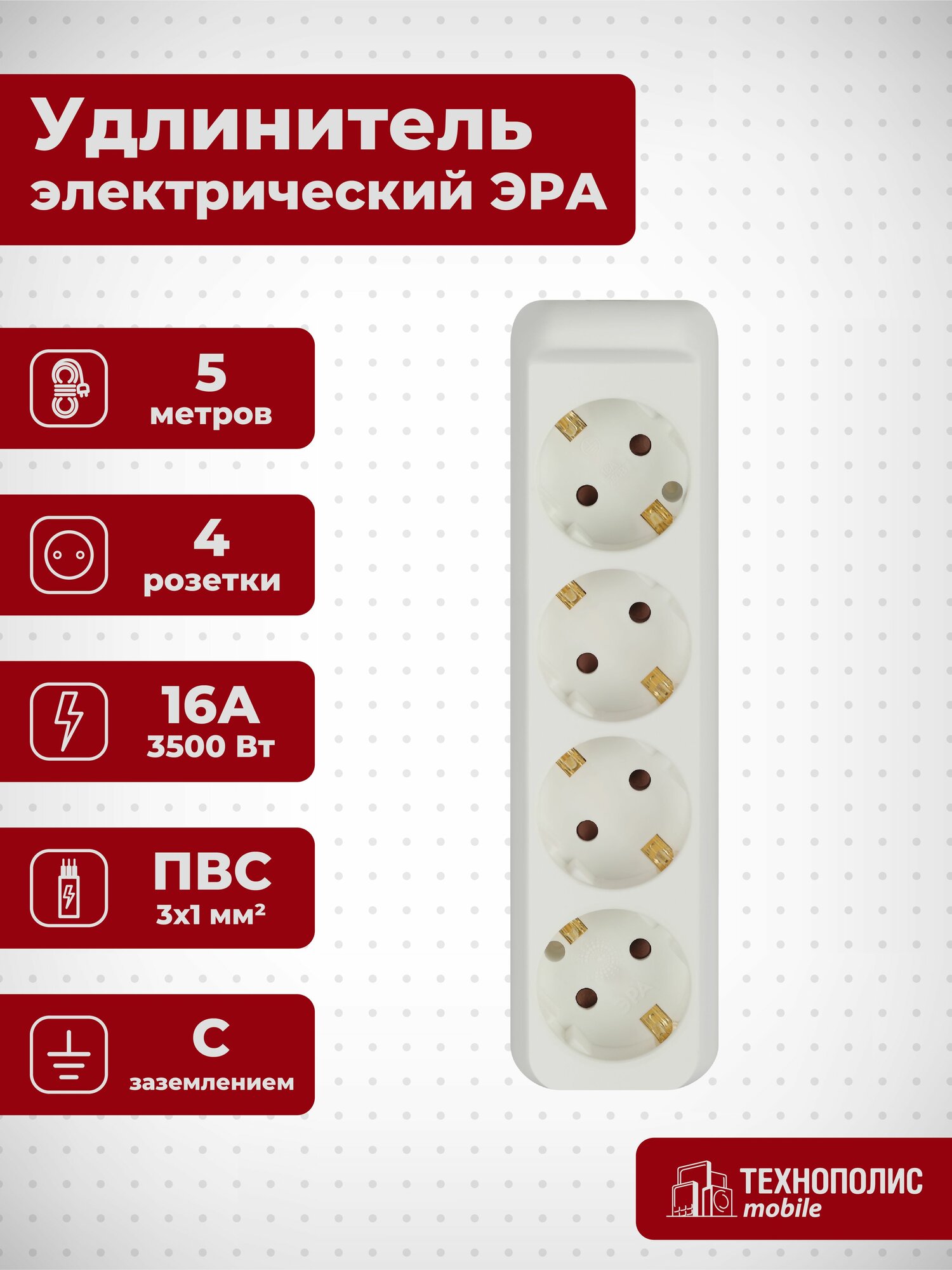 Удлинитель электрический ЭРА с заземлением 4 розетки 5м ПВС 3x1 16А, Белый, U-4e-5m-3x1