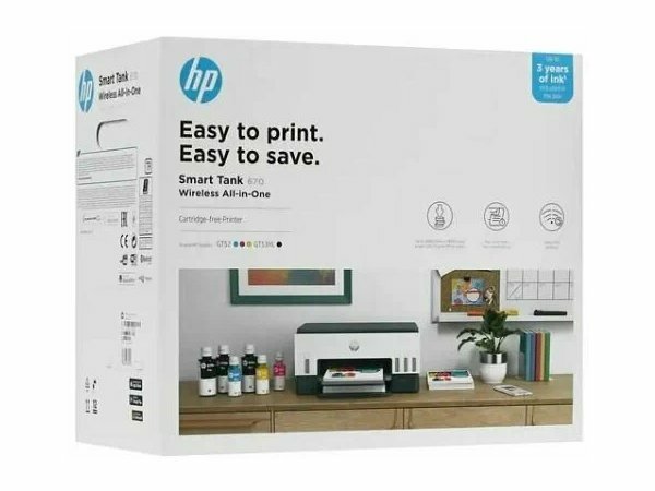 | Комплектация | МФУ HP Smart Tank 670, бутылочки с оригинальными черными чернилами HP GT53XL (135 мл) - 3 шт., бутылочка с оригинальными голубыми чернилами HP GT52 - 1 шт., бутылочка с оригинальными пурпурными чернилами HP GT52 - 1 шт., бутылочка с оригинальными желтыми чернилами HP GT52 - 1 шт., кабель питания - 1 шт., черная печатающая головка HP, трехцветная печатающая головка HP |