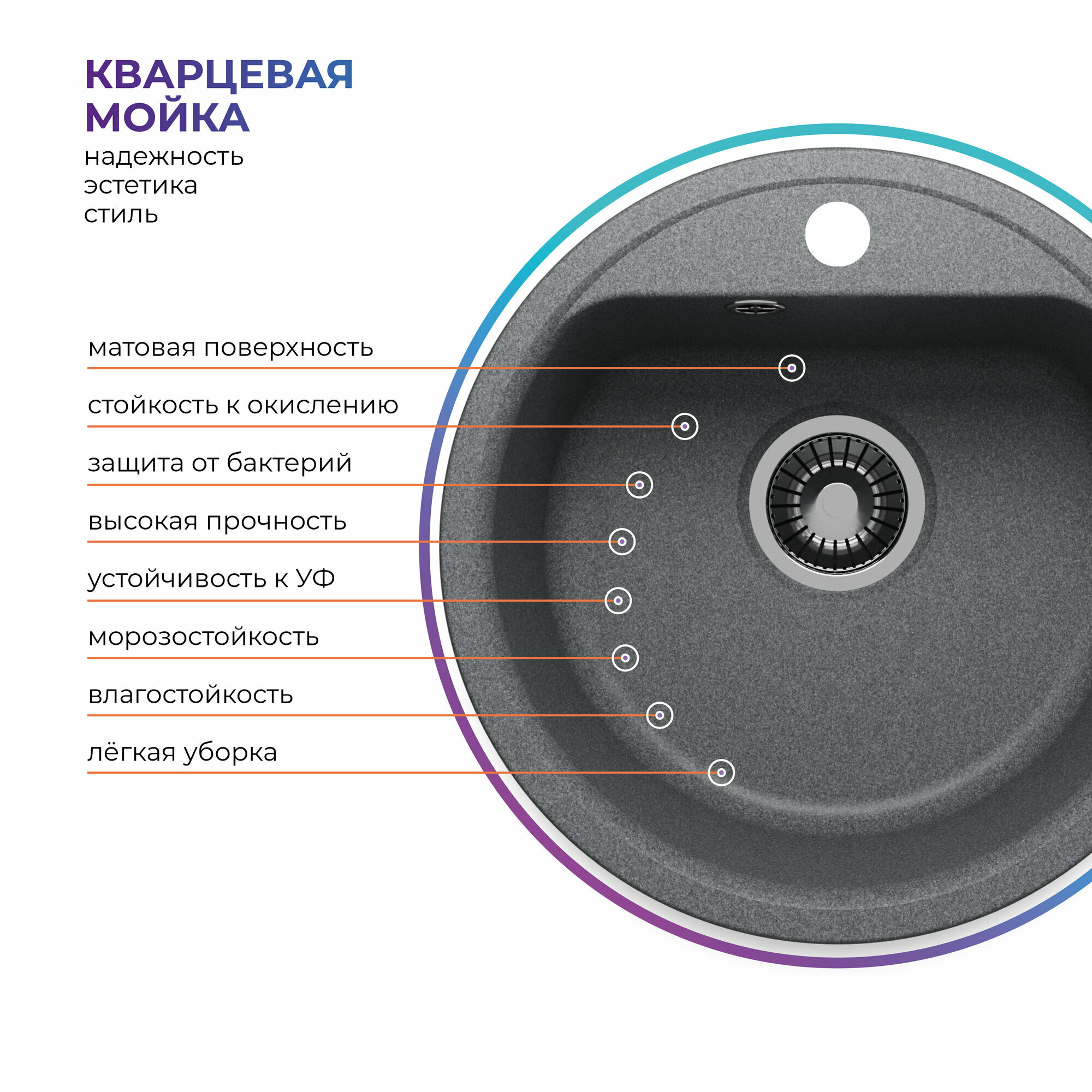 Кухонная мойка кварцевая QUARTZBOND BOND-480 Cерая, круглая (Грей)