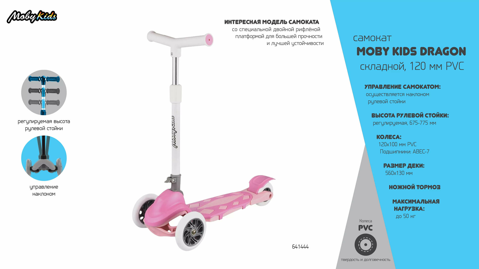 СамокатMobyKids Dragon (3-х колесный, складной, 55*24*30см, колеса PVC, максимальная нагрузка 50кг,