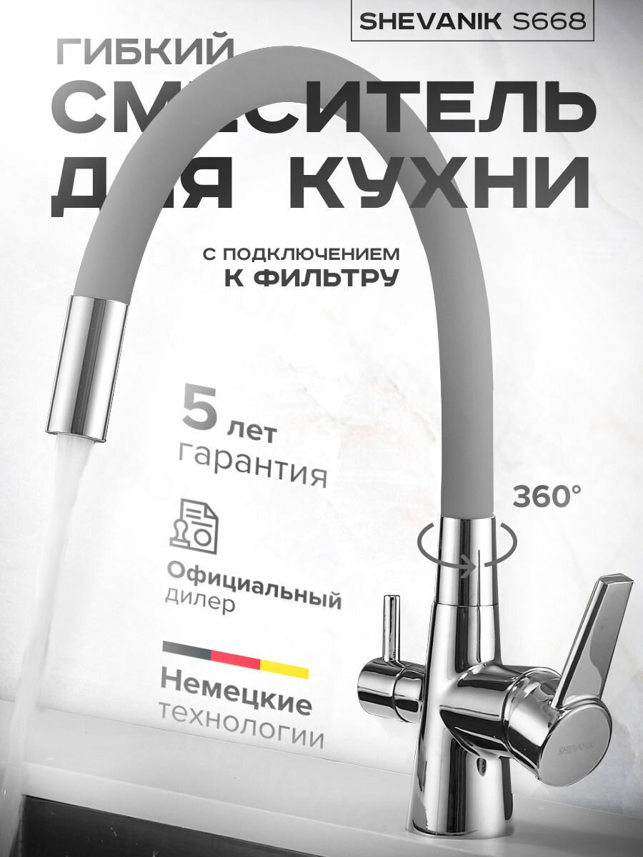 Смеситель для кухни с гибким изливом и подключением фильтра Shevanik S668, хром/серый