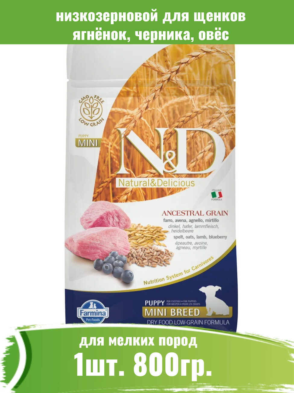 Farmina N&D ANCESTRAL GRAIN для щенков MINI ягнёнок, спельта, овес, черника 0,8 кг (1/10)