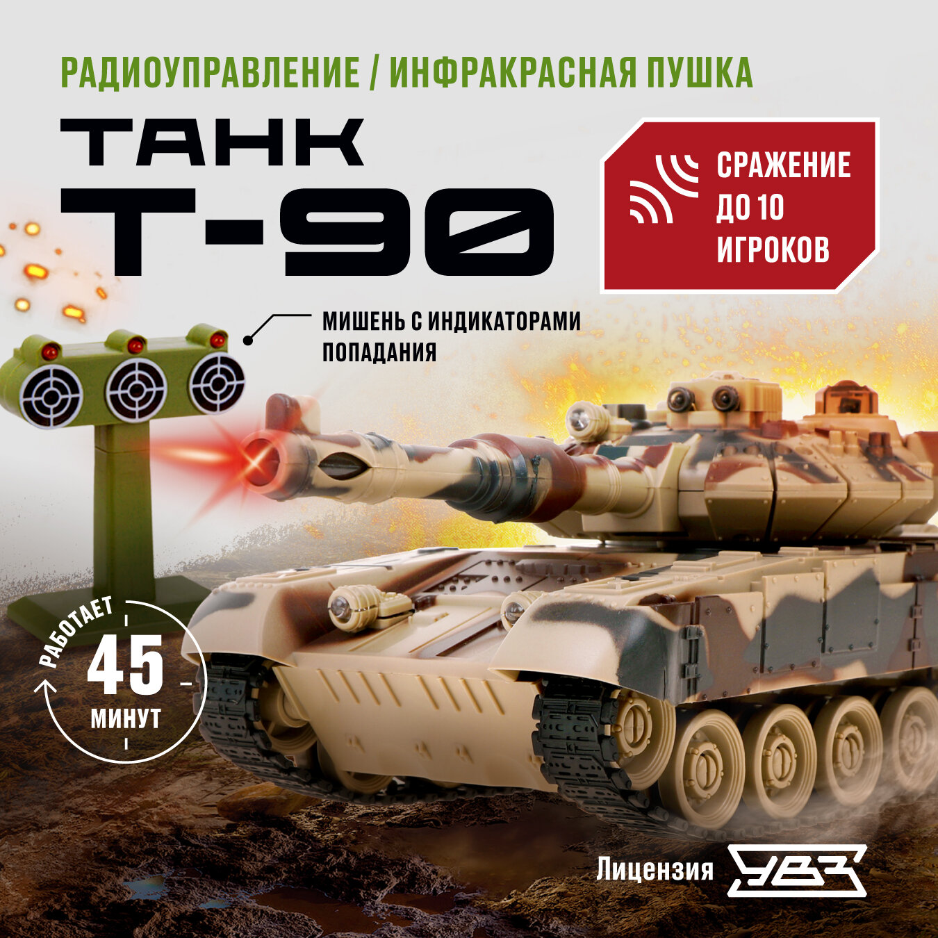 Танк р/у 1:24 Т-90 (Россия), аккум. Тренировочная мишень с индикаторами жизни, мина со свет., звук.