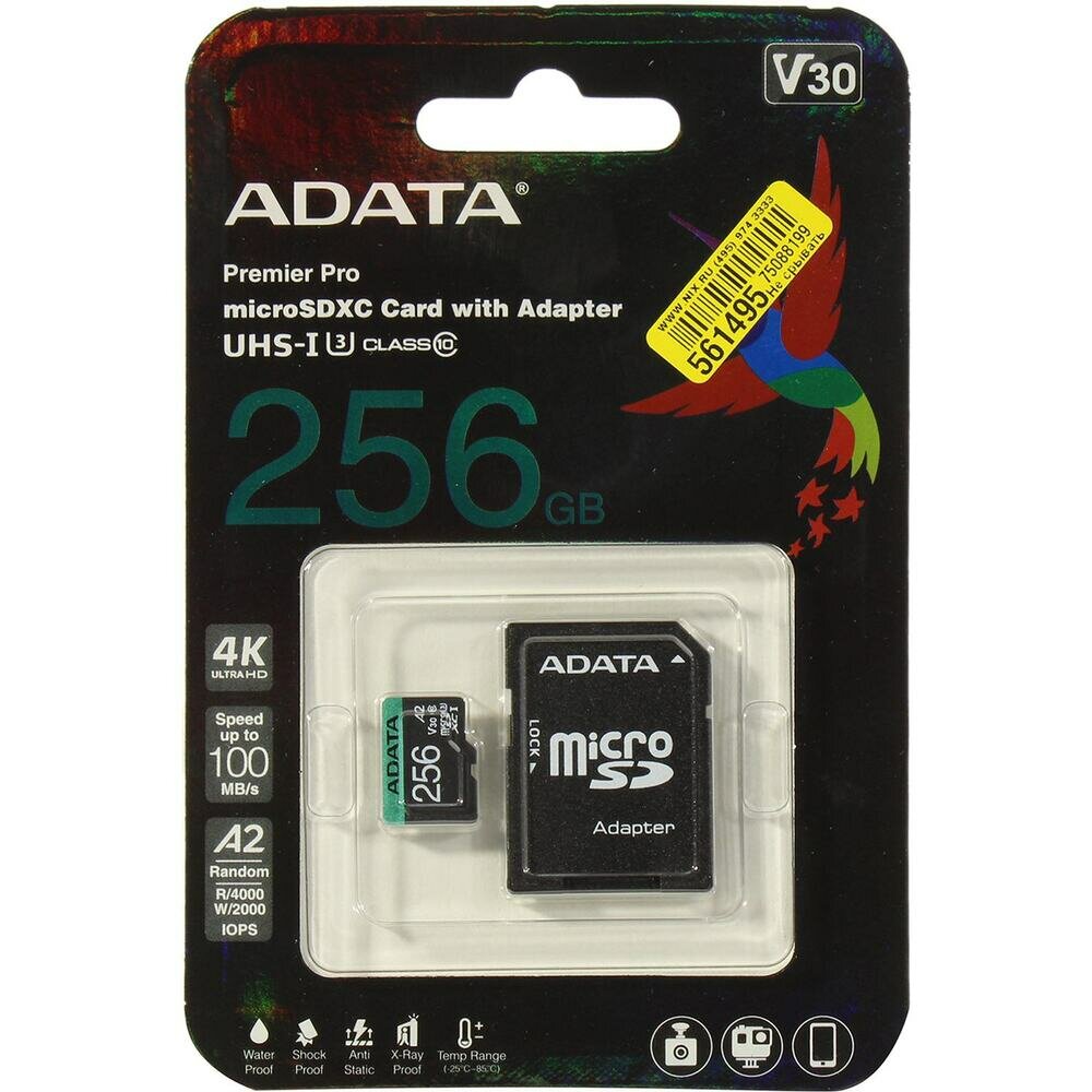 Карта памяти microSDXC UHS-I U3 A-Data Premier Pro 256 ГБ, 100 МБ/с, Class 10, AUSDX256GUI3V30SA2-RA1, 1 шт., переходник SD