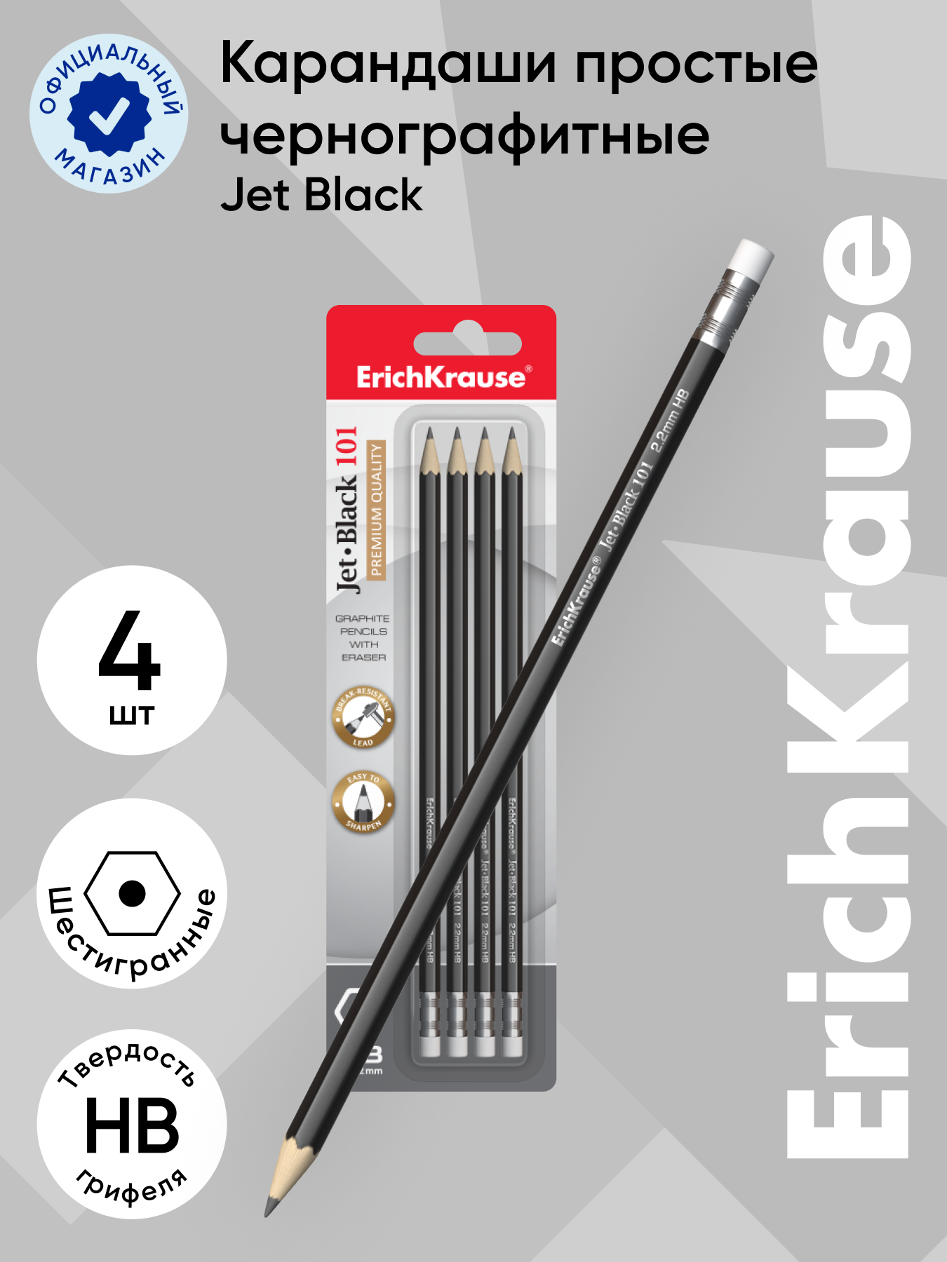 Чернографитный шестигранный карандаш с ластиком ErichKrause Jet Black 101 HB (в блистере по 4 шт.)