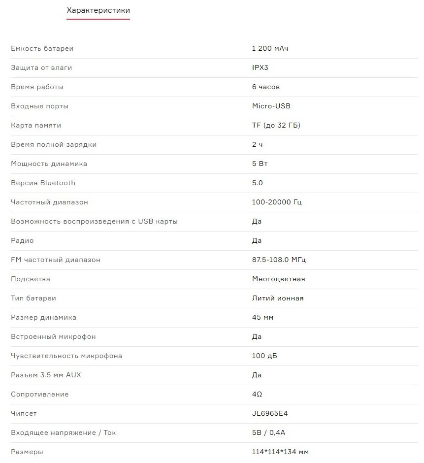 | Особенности | FM-радио / встроенный микрофон (функция HandsFree) / поддержка SD / световые эффекты |