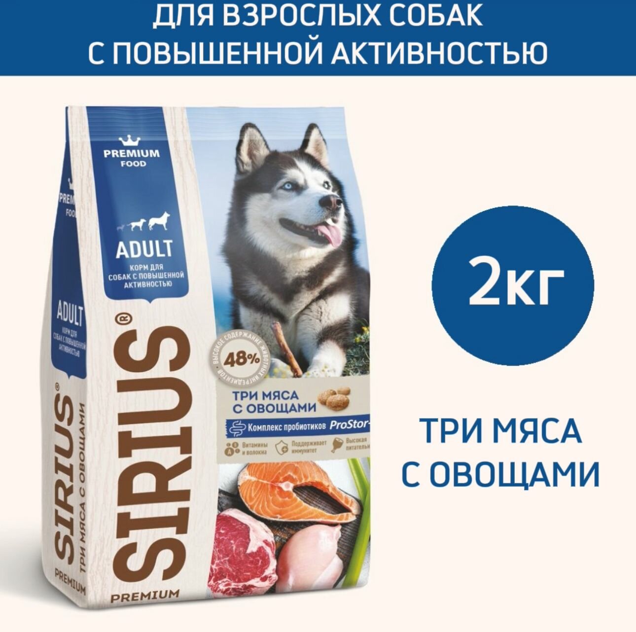 Сухой корм SIRIUS PREMIUM, Сириус для собак с повышенной активностью, три мяса с овощами, 2 кг