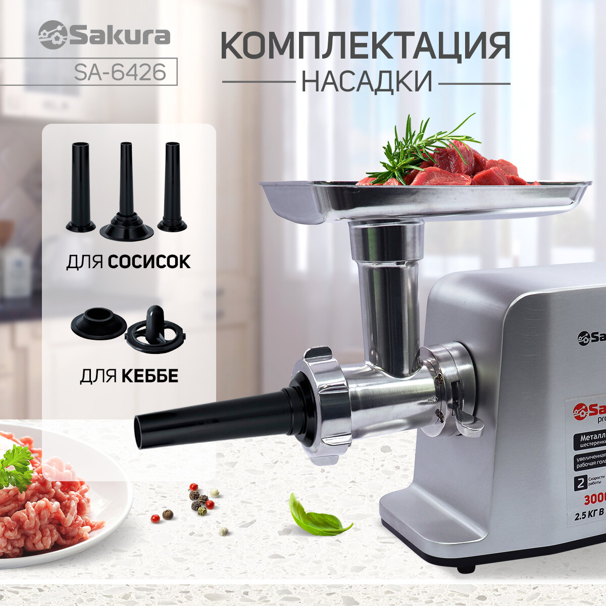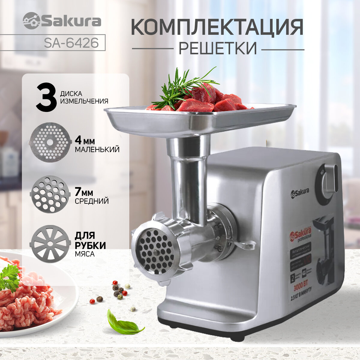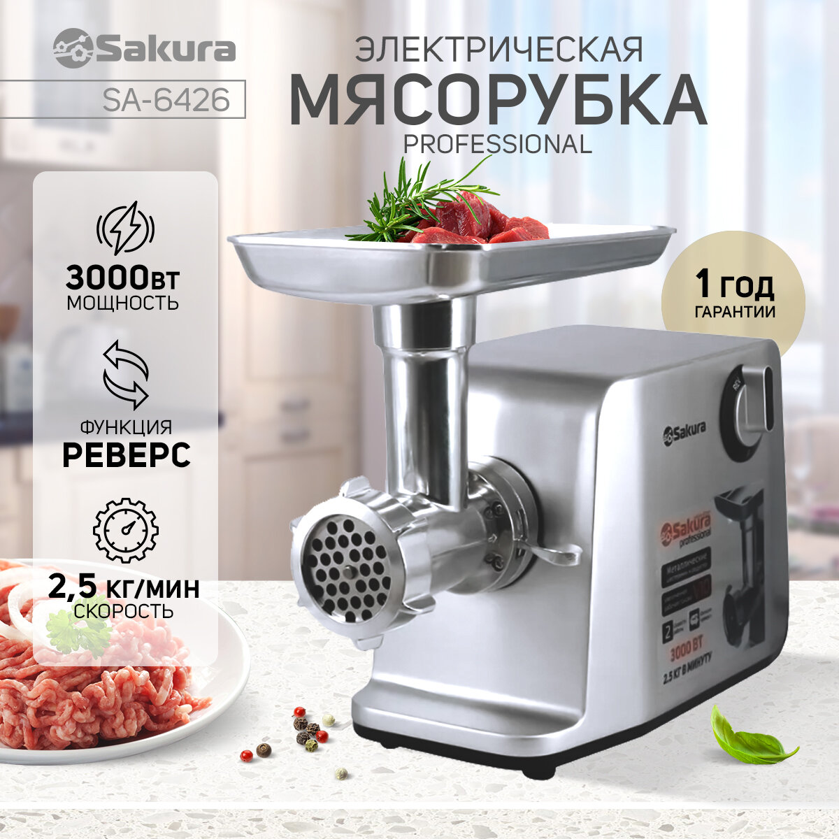 Мясорубка Sakura SA-6426 Professional 3000Вт, реверс, две скорости, комплект насадок интересное: