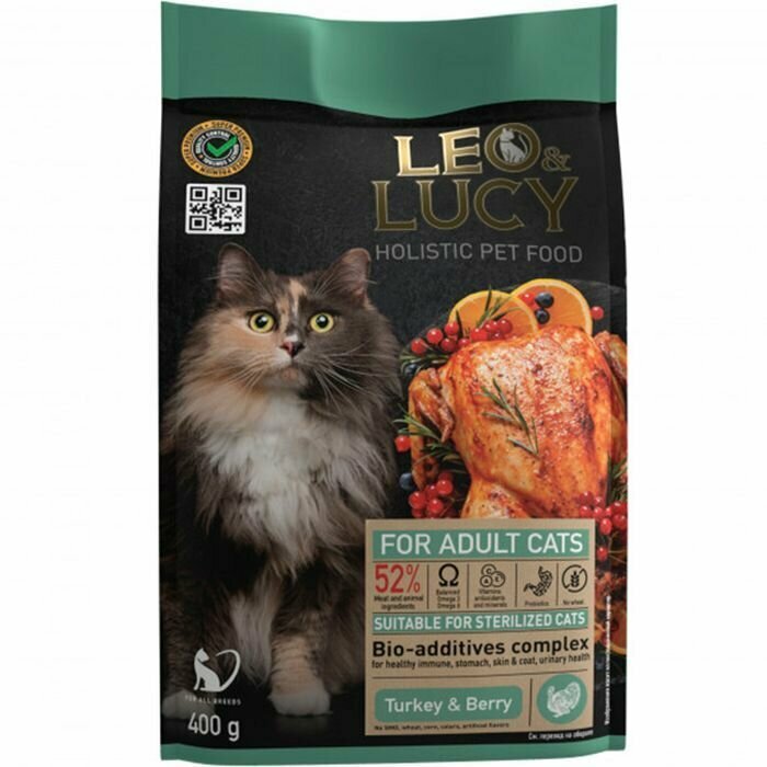 LEO&LUCY 400гр. корм для кошек с индейкой, ягодами и биодобавками, подходит для стерилизованных