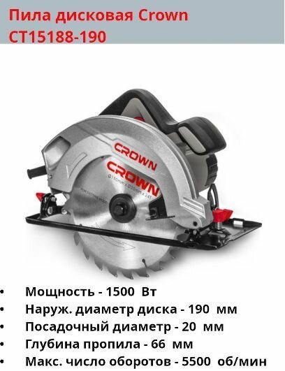Циркулярная пила дисковая CROWN CT15188-190 (1500Вт, 5500об/мин, диск 190/185*20*2,0мм, 4,4кг)