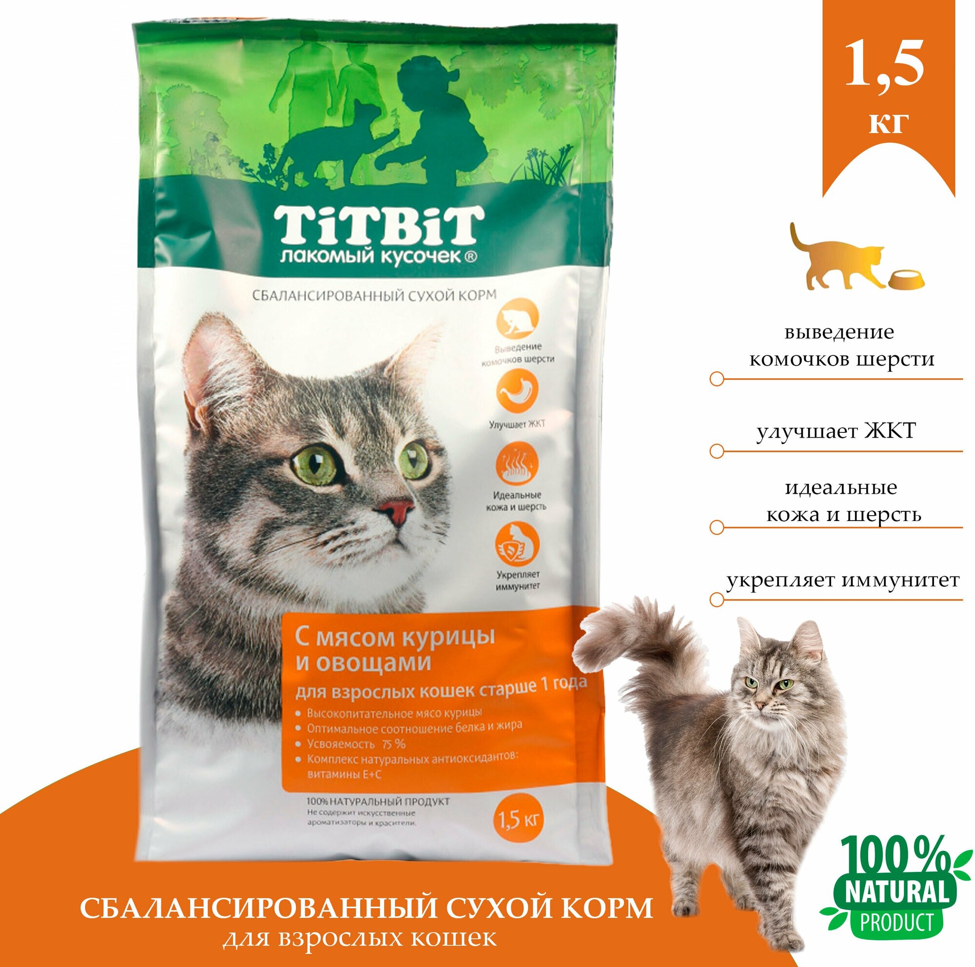 Корм сухой для взрослых кошек TiTBiT полнорационный, с мясом курицы и овощами 1,5 кг