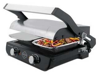 | Плюсы: | Мощность 2300 Вт,длина шнура 1,2 м,4в 1: гриль,барбекю,запекание,сэндвич- тостер.В комплект входят шипцы и скребок. |