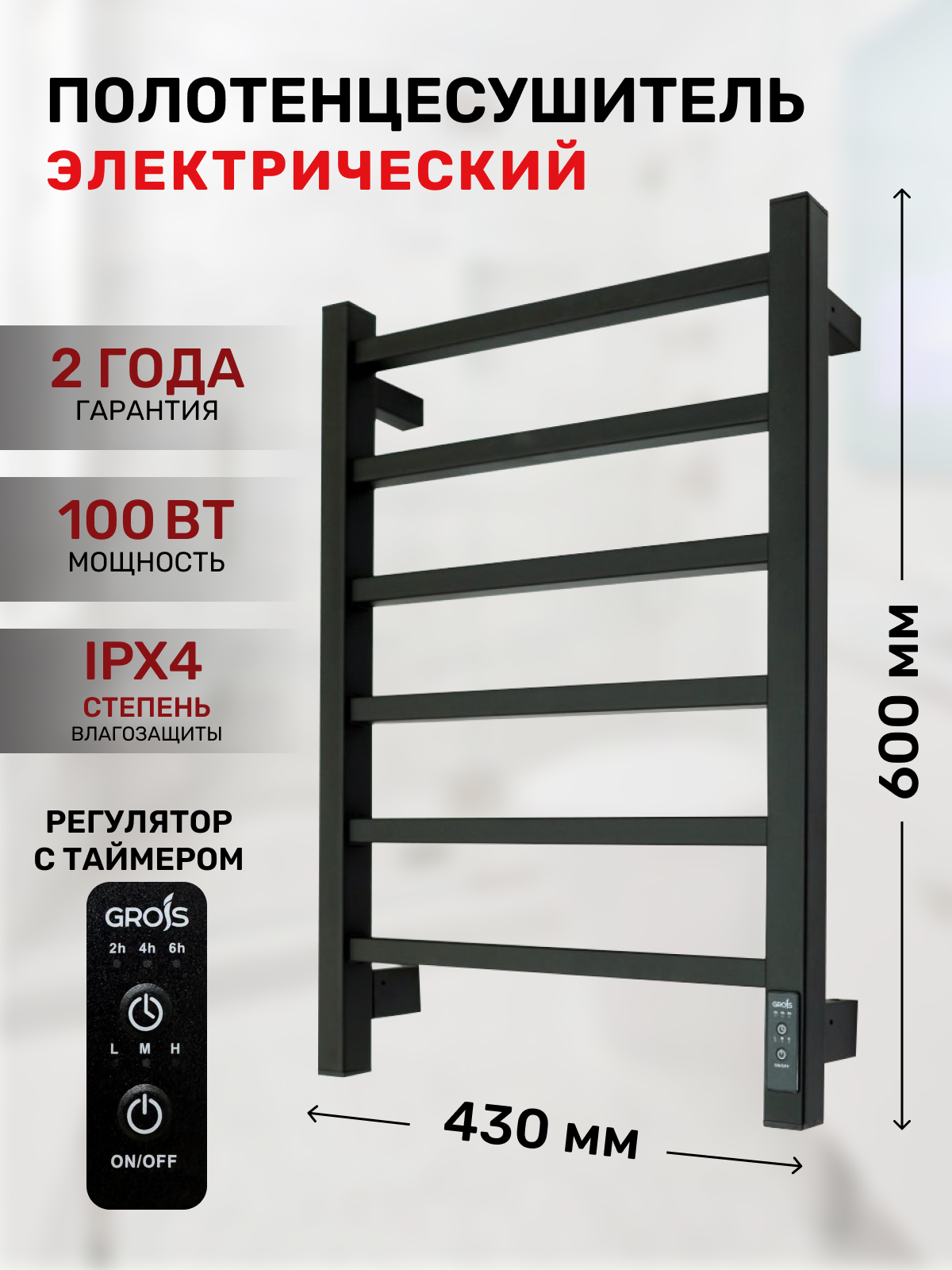 Полотенцесушитель электрический Grois Alex GR-101 500мм 600мм П6 черный матовый подключение универсальное форма Лесенка
