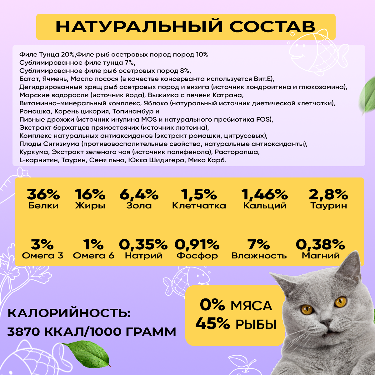 | Состав | Филе Тунца 20%,Филе рыб осетровых пород пород 10% Сублимированное филе тунца 7%, Сублимированное филе рыб осетровых пород 8%, Батат, Ячмень, Масло лосося (в качестве консерванта используется Вит.E), Дегидрированный хрящ рыб осетровых пород и визига (источник хондроитина и глюкозамина), Морские водоросли (источник йода), Выжимка с печени Катрана, Витаминно-минеральный комплекс, Яблоко (натуральный источник диетической клетчатки), Ромашка, Корень цикория, Топинамбур и Пивные дрожжи (источник инулина MOS и натурального пребиотика FOS), Экстракт бархатцев прямостоячих (источник лютеина), Комплекс натуральных антиаксиданов (экстракт ромашки, цитрусовых), Плоды Сигизиума (противовоспалительные свойства, натуральные антиоксиданты), Куркума, Экстракт зеленого чая (источник полифенола), Расторопша, L-карнитин, Таурин, Семя льна, Юкка Шидигера, Мико Карб |