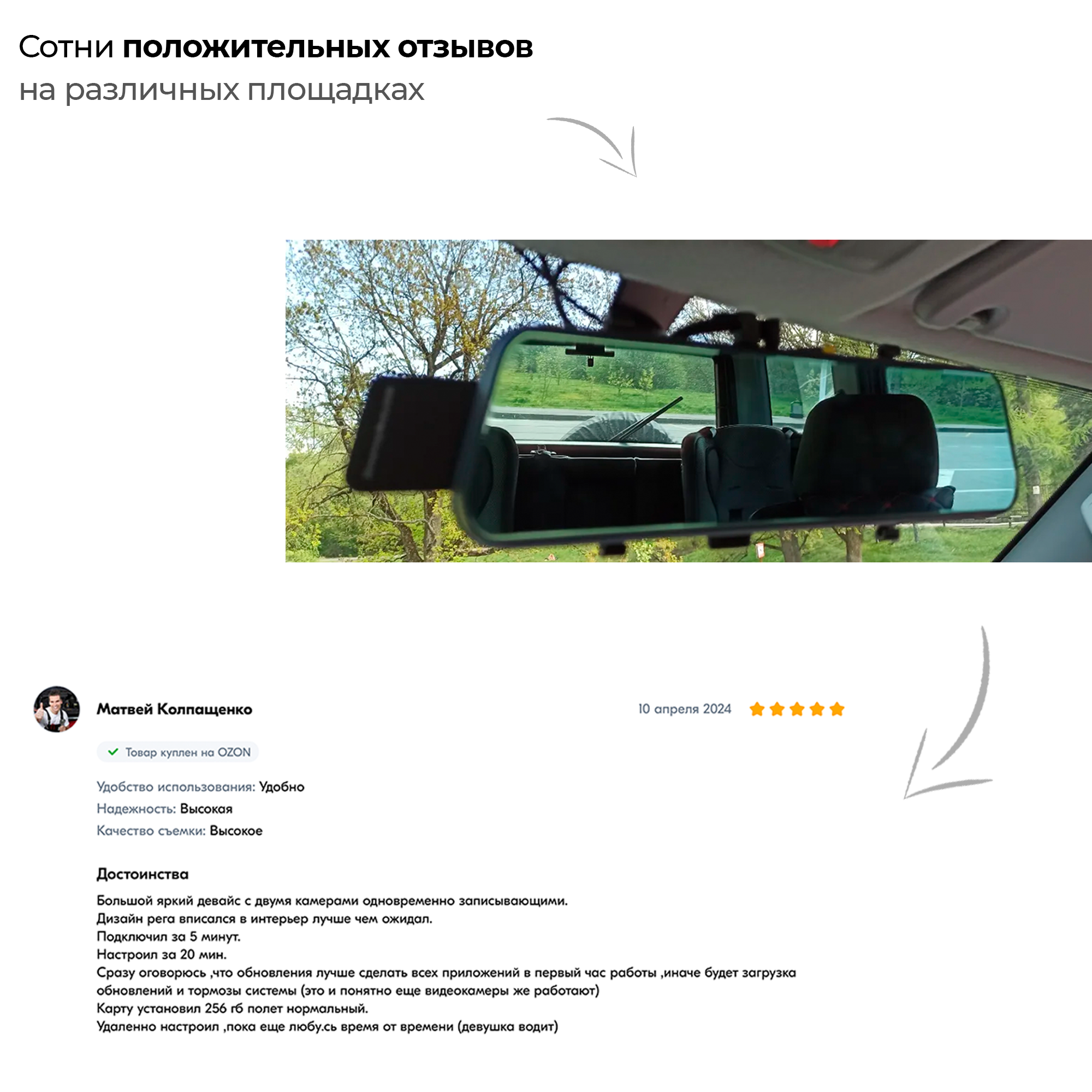 | Плюсы: | Не мешает обзору,покупаю уже на 5 машину, без него чувствую,что чего то не хватает , запись с обоих камер ,навигатор и Яндекс и много других, оплачиваю заправку прямо с зеркала , чудо ! |