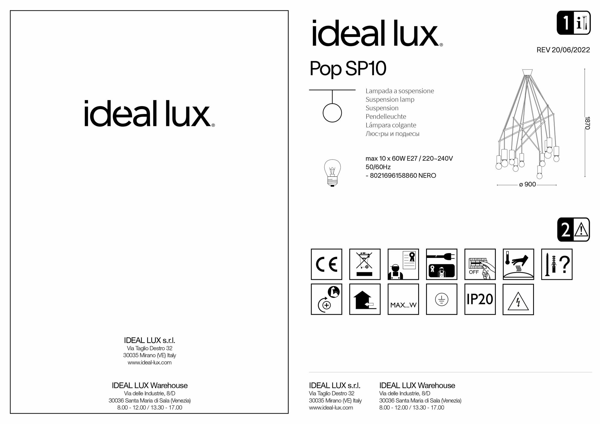 СохранитьСветильник подвесной ideal lux Pop SP10 макс.10x60Вт IP20 E27 230В Черный Металл Без ламп 158860. интересное: