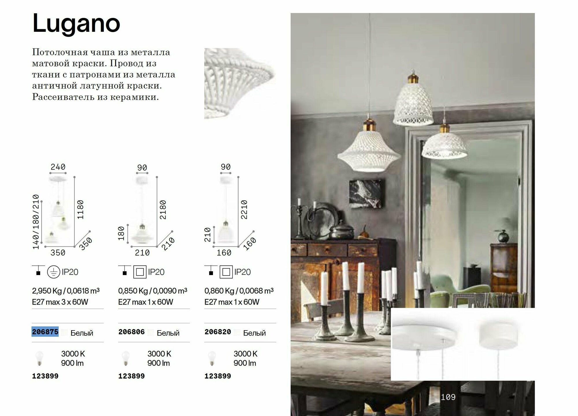 Светильник подвесной ideal lux Lugano SP3 макс.3x60Вт IP20 Е27 230В Белый/Латунь Керамика/Металл Без ламп 206875. интересное:
