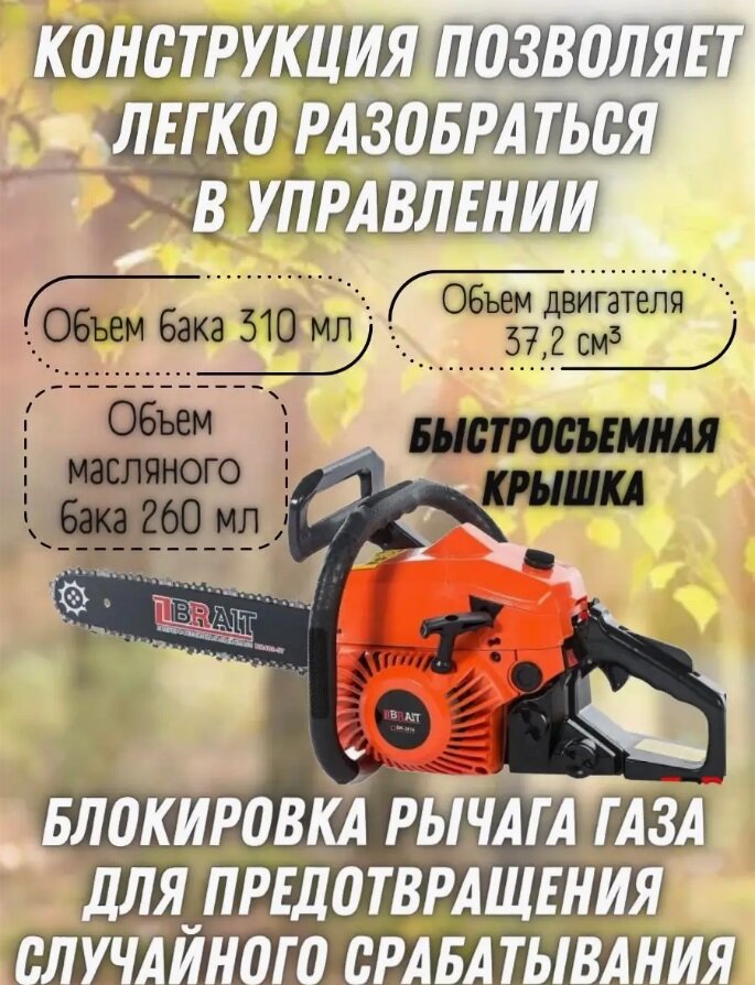 Бензопила цепная бензиновая BRAIT BR 4515 / пила садовая для дров, для дачи (шина 38 см, мощность 1700 Вт)