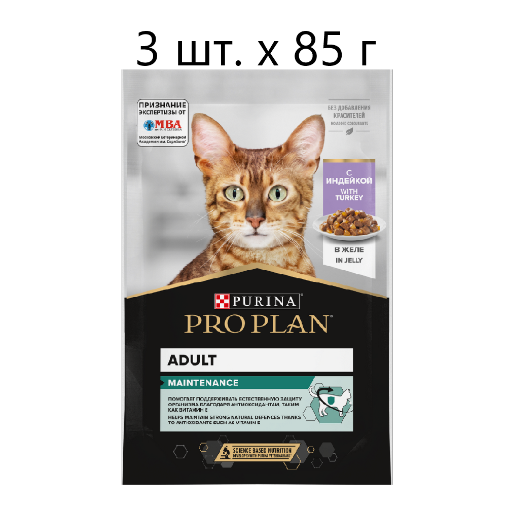 Купить Влажный корм для кошек Purina Pro Plan Adult Maintenance with Turkey, для взрослых, индейка, 3 шт. х 85 г (кусочки в желе)