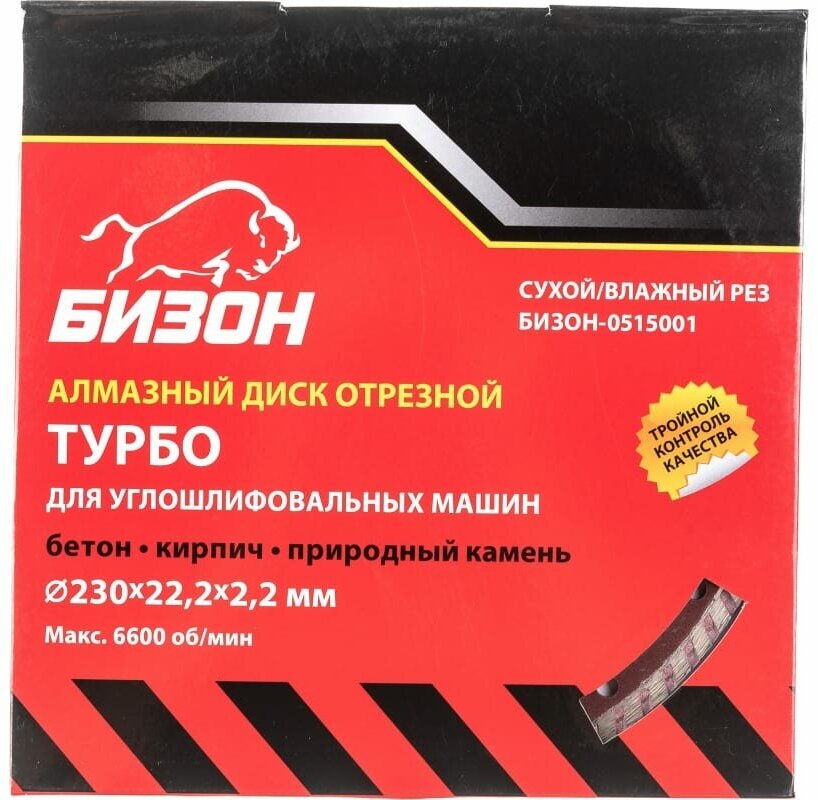 Бизон Диск алмазный отрезной 230*22,2мм*2,2мм,турбо,сухой/влажный рез,по бетону,кирпичу,камню,карт.к