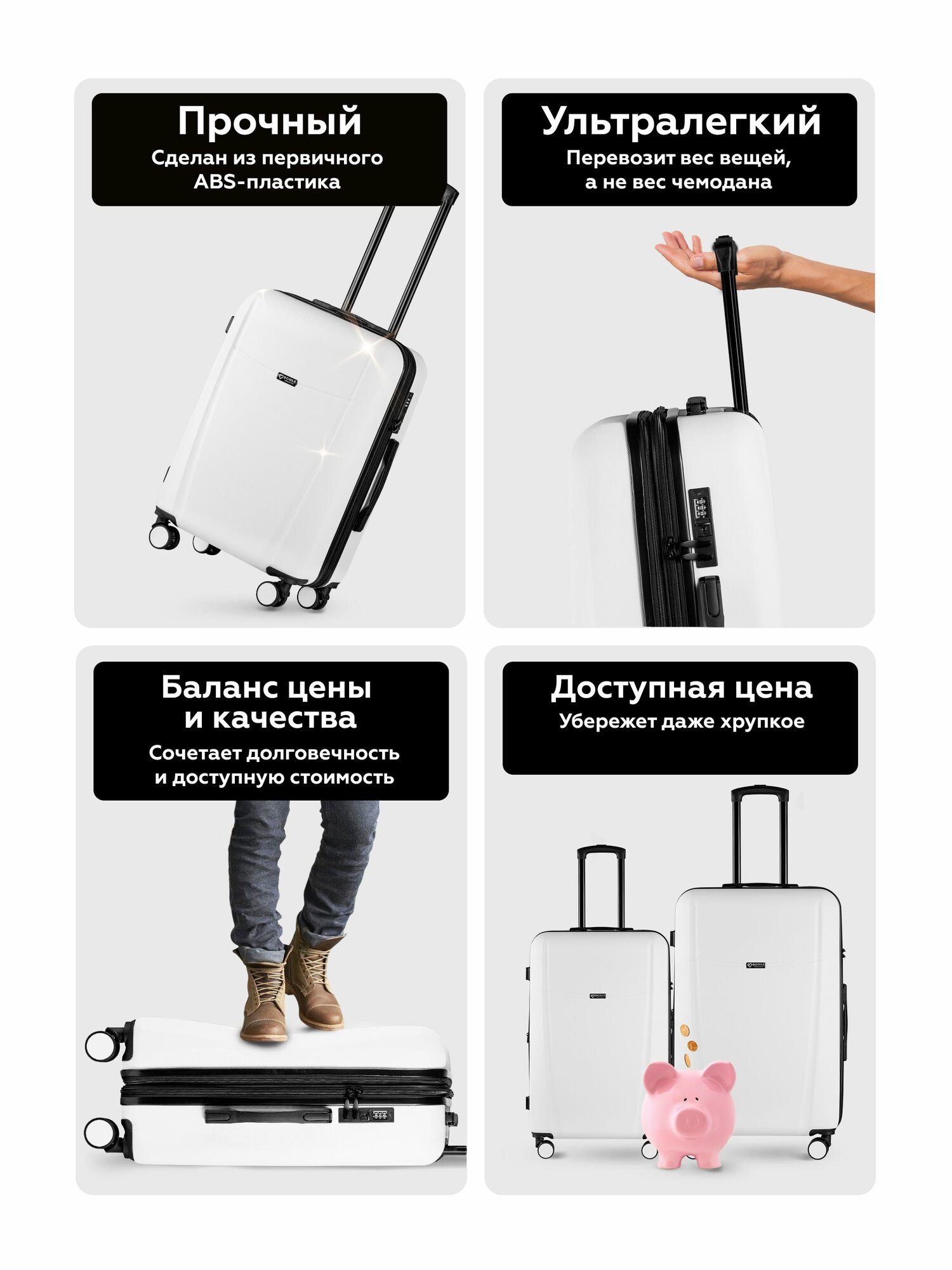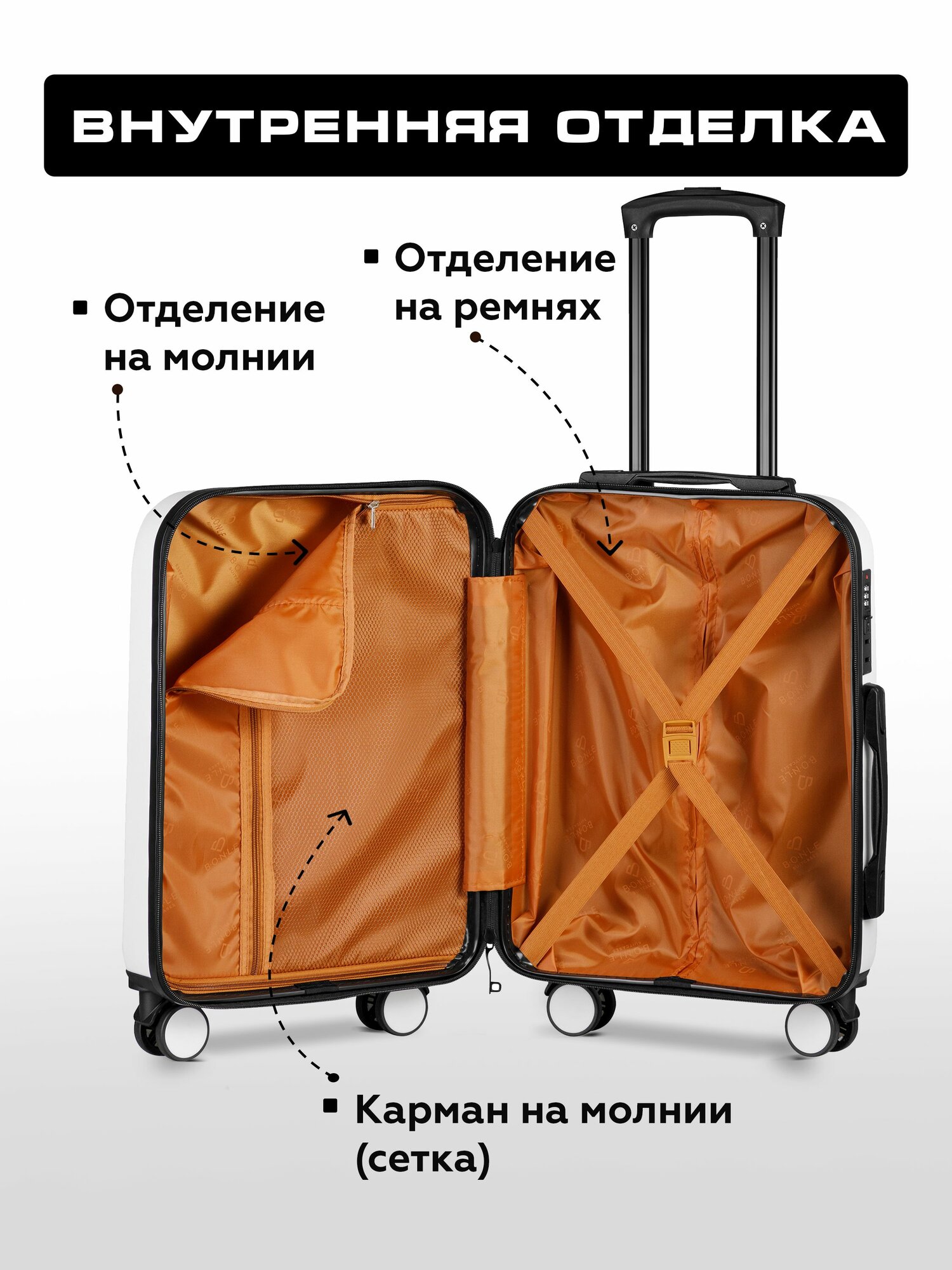 Чемодан на колесах M белый Bonle, премиум ABS-пластик 66,5 см, 62 л, средний дорожный