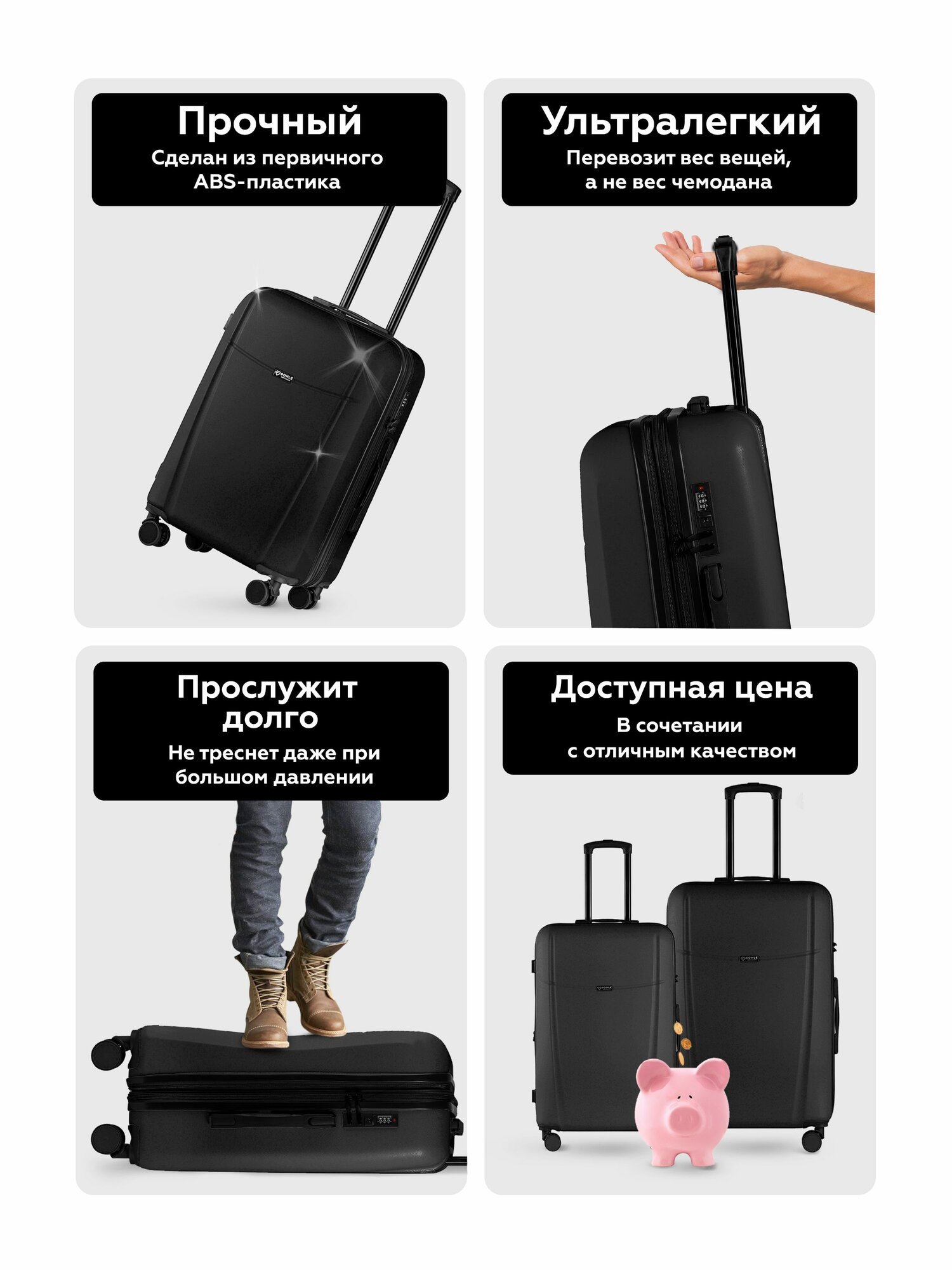 Чемодан на колесах L черный Bonle, премиум ABS-пластик 75,5 см, 101 л, большой дорожный