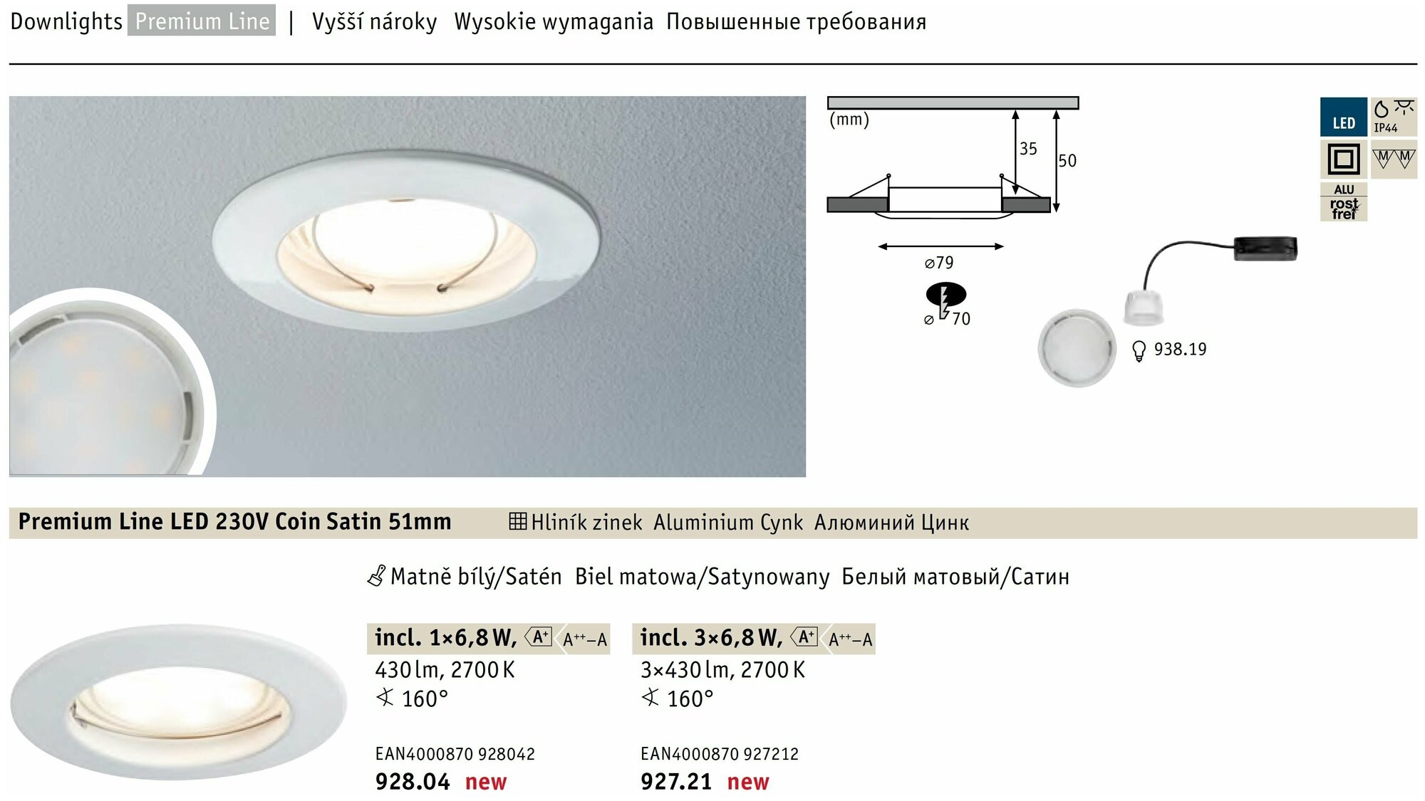 Светильник встраиваемый Paulmann Premium Line 6.8Вт 430Лм 2700К IP44 LED Coin 230В Белый Не димм Д79мм 92804