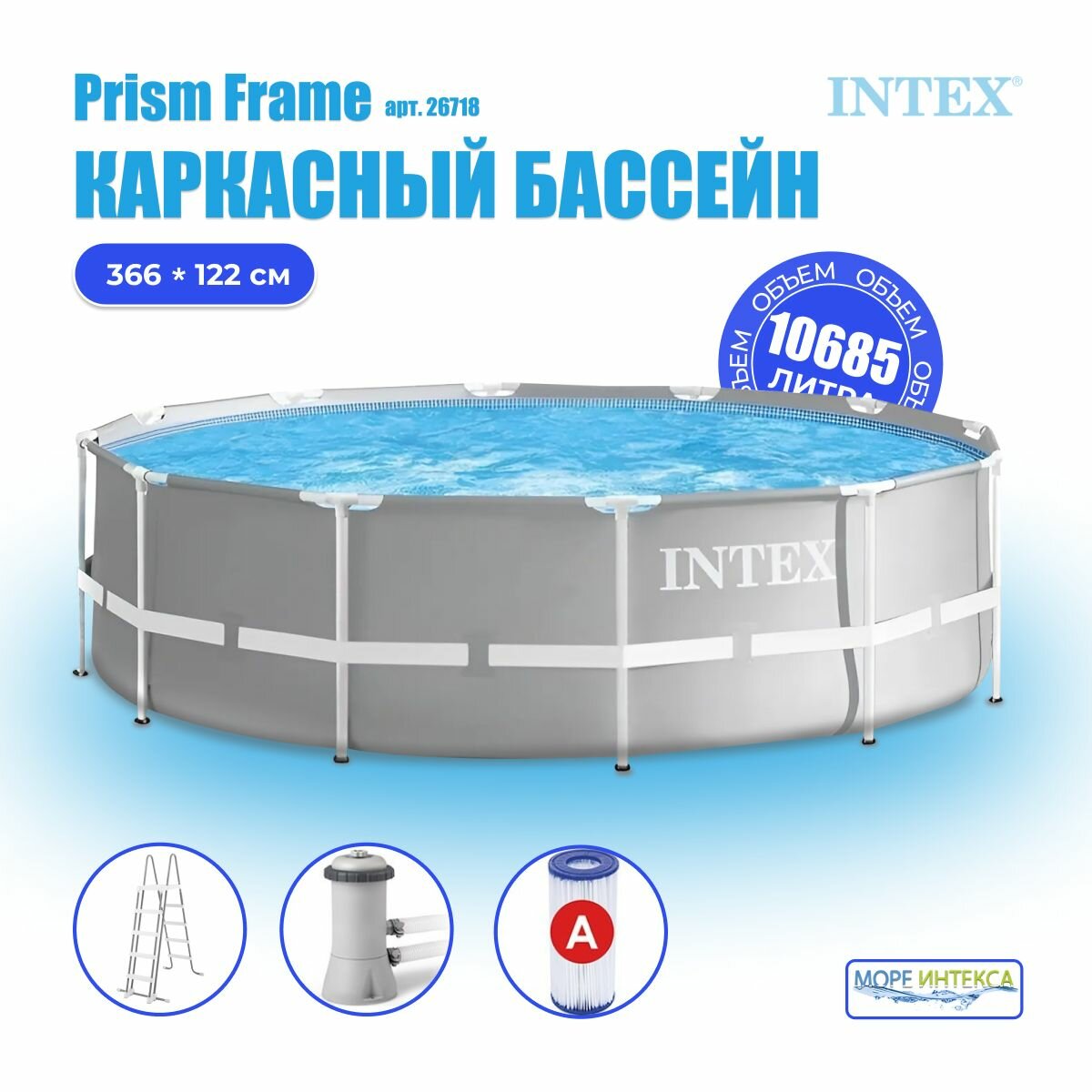 Бассейн каркасный круглый 366х122 10658л ф.-н. 3875 л/ч, серии Prism Frame, большой для всей семьи 26718 Intex