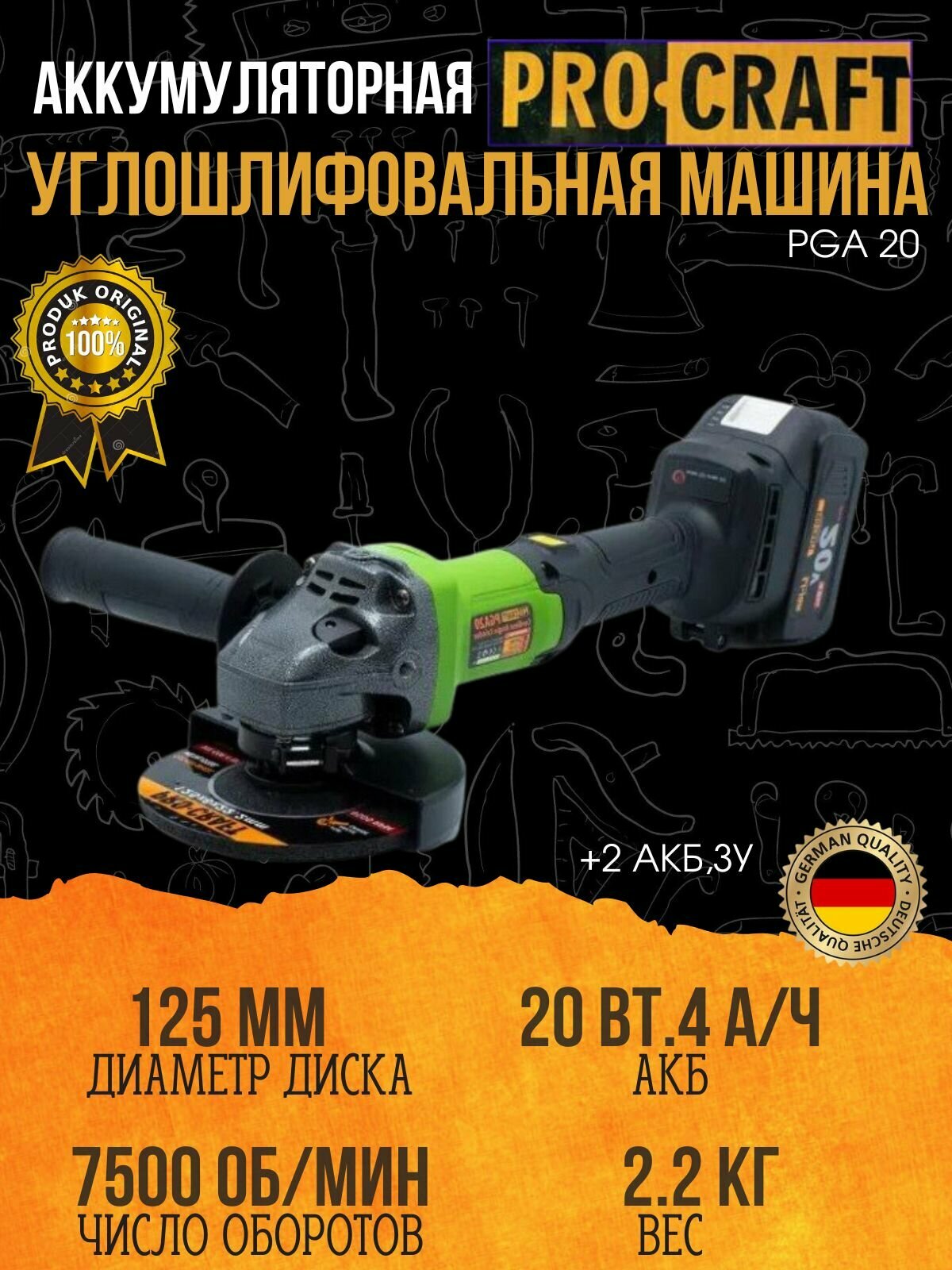 Купить Углошлифовальная машина болгарка аккумуляторная Procraft PGA-20, 125мм круг, 2 АКБ + ЗУ, 7500об/мин