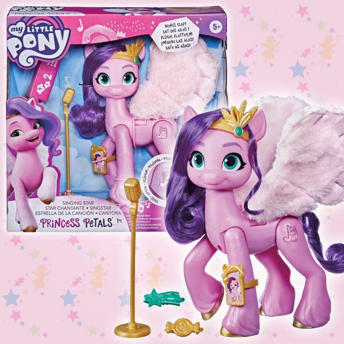 | Дополнительная информация | фигурка Принцессы Петалс имеет фиолетовые волосы и знак отличия в виде ноты, нажав на который, можно услышать песню из мультфильма «My Little Pony: Новое поколение»; чтобы пони взмахнула пушистыми крыльями, сожмите задние ноги фигурки вместе; песня звучит только на английском языке, для работы требуется 1 батарейка типа ААА |