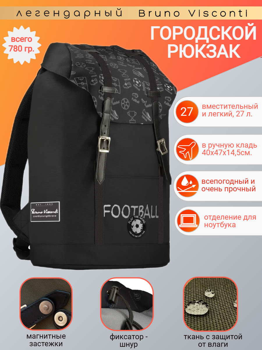 Рюкзак BrunoVisconti, городской, черный , «SPORT PATTERN.футбол», Арт. 12-011-036/01
