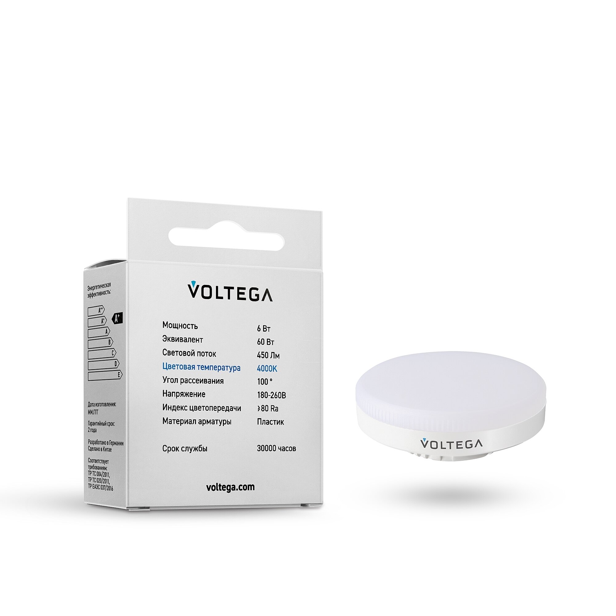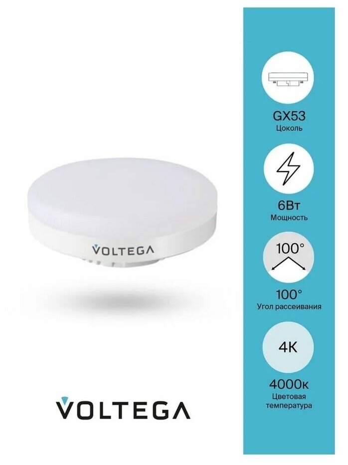 Светодиодная лампа Voltega 7771 LED GX53 6W 4000К (нейтральный белый). Форма колбы лампочки - таблетка