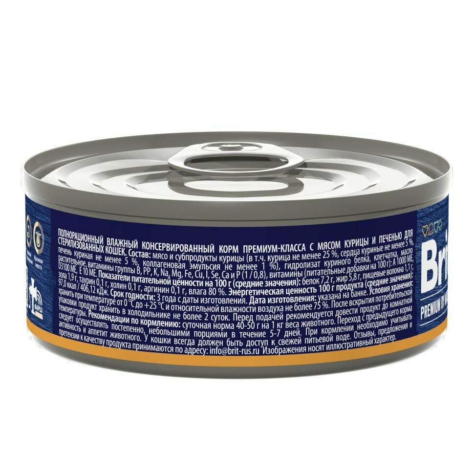 Brit: Premium by Nature, Консервы с мясом курицы и печенью, для стерилизованных кошек, 100 гр. интересное: