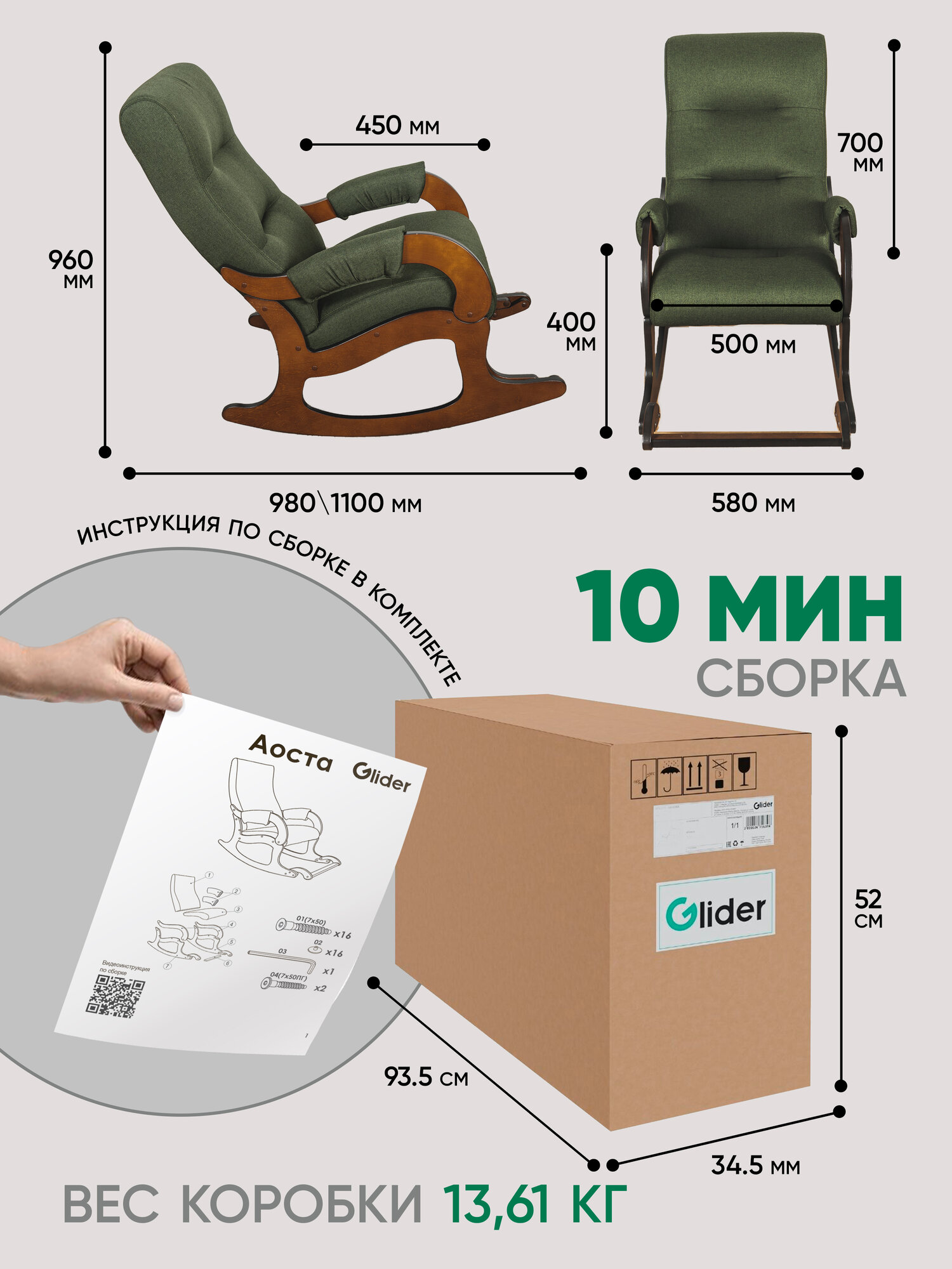| Дополнительная информация | Кресло-качалка от российской компании-производителя Glider станет любимой вещью в Вашем доме. Благодаря продуманному дизайну и компактности(96x57,9x96-108 см) кресло для отдыха отлично вписывается в любой интерьер, будь то дом или офис. Анатомическая спинка прекрасно расслабляет спину и шею.) Кресло имеет безопасный угол качания - это исключает возможность опрокидывания. (Удобная складывающаяся подножка не мешает раскачиванию, позволяет расслабить ноги). Изделие выполнено из качественных материалов. Каркас кресла сделан из натуральной березы, а обивка - из плотной износостойкой ткани. Все материалы гипоаллергенны и безопасны как для взрослых, так и для детей. |