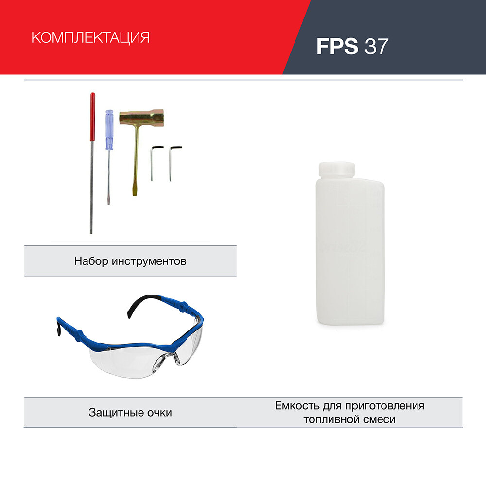 | Комплект поставки | шина, цепь, чехол для шины, емкость для приготовления топливной смеси, набор инструмента, защитные очки, напильник для заточки цепи |