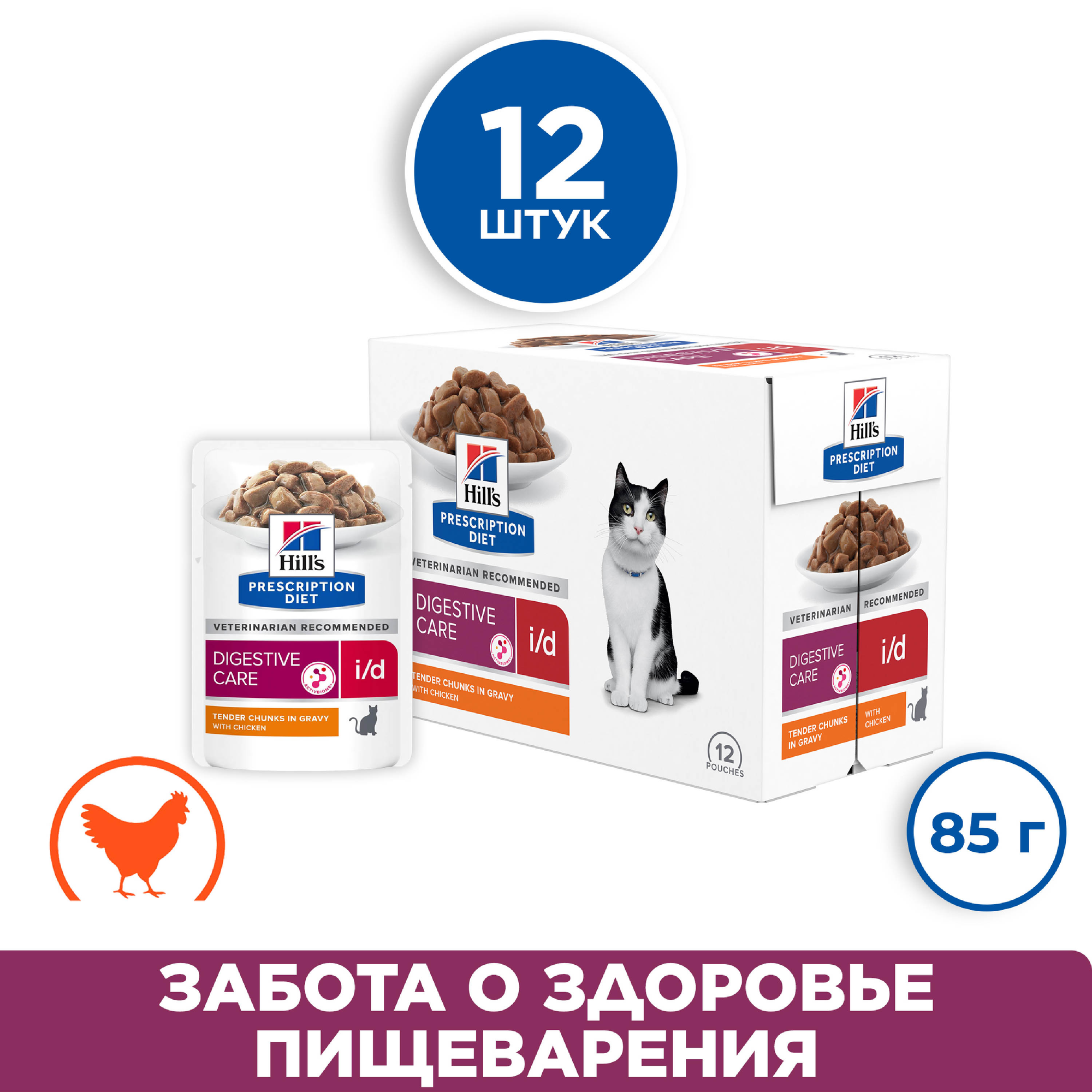 Влажный диетический корм для кошек Hill's Prescription Diet i/d Digestive Care при расстройствах пищеварения, жкт, с курицей, 12 шт. х 85 г (кусочки в соусе)