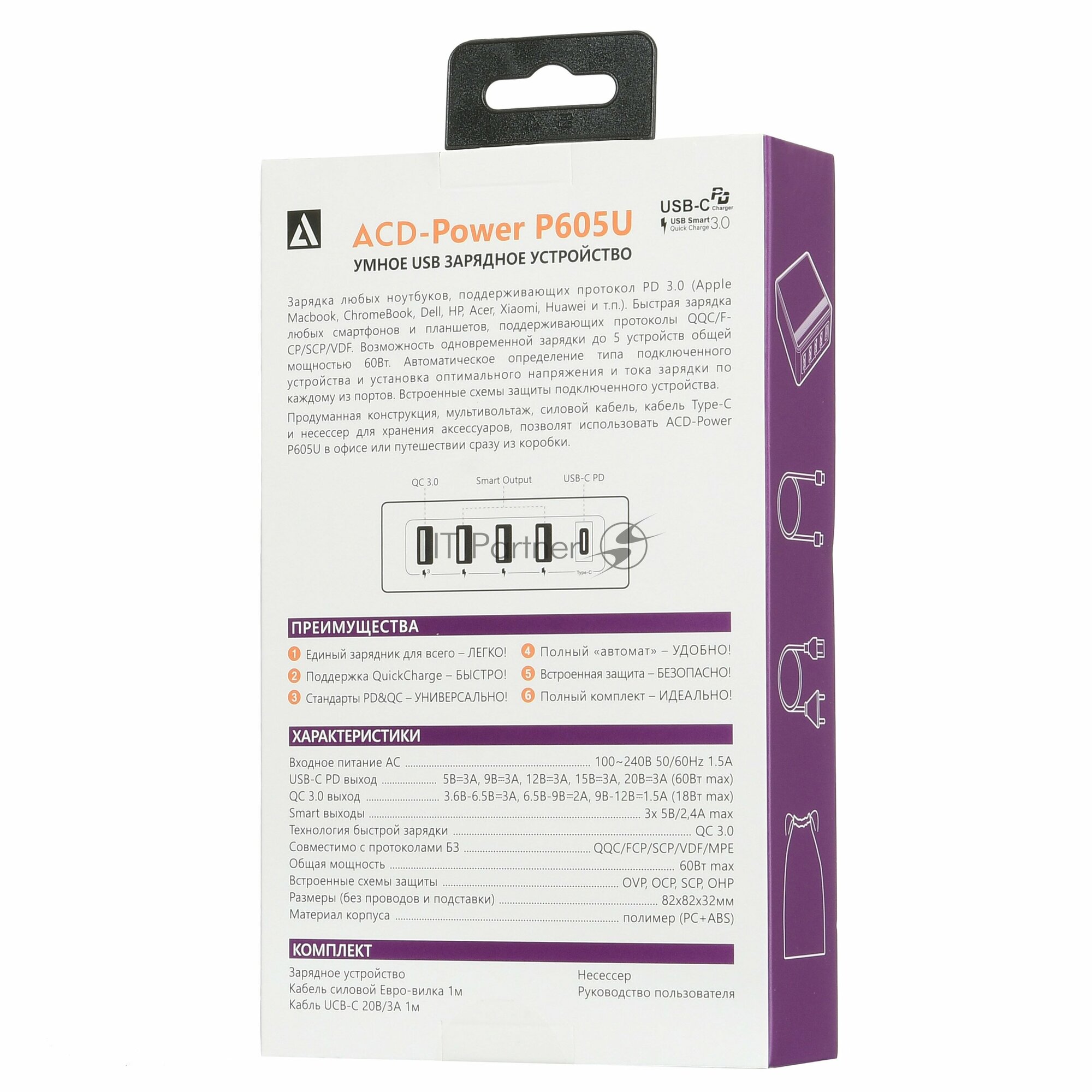Купить Зарядное устройство сетевое ACD ACD-P605U-V1B 60Вт, 5xUSB 1PD+1QC+3Smart, 3.6~20В/3А, RTL