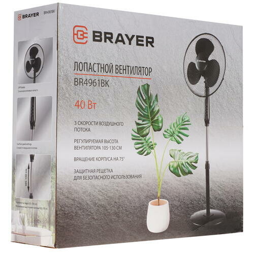 Вентилятор BRAYER 3 скорости, 3 лопасти, регулировка уровня наклона, 40 Вт, основание 60см 4961BRR-BK BR4961BK