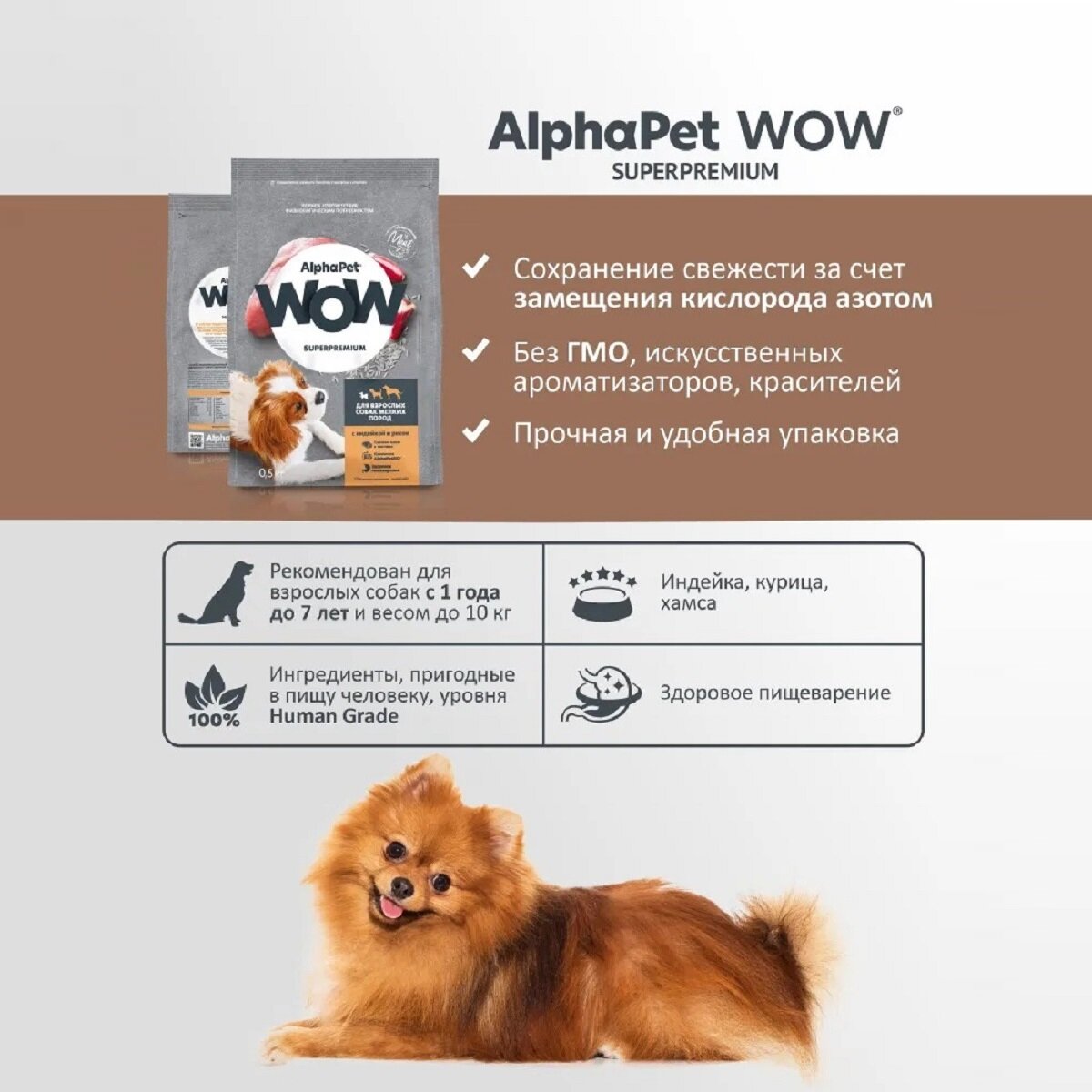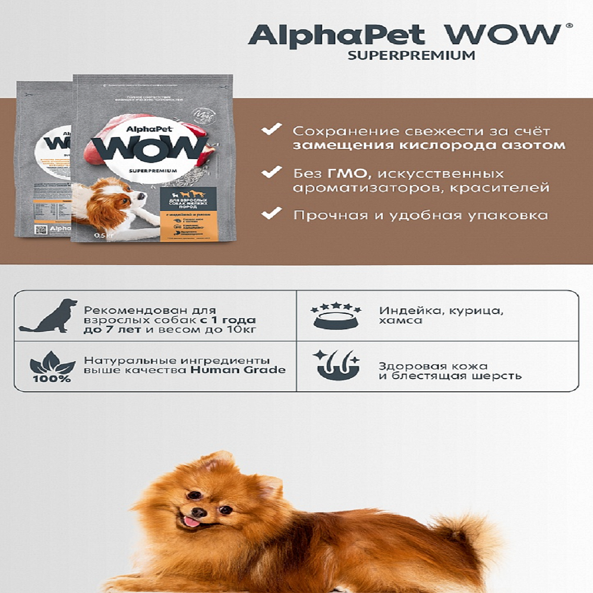 СохранитьAlphaPet WOW Superpremium сухой полнорационный корм для взрослых собак мелких пород с индейкой и рисом - 500 г интересное: