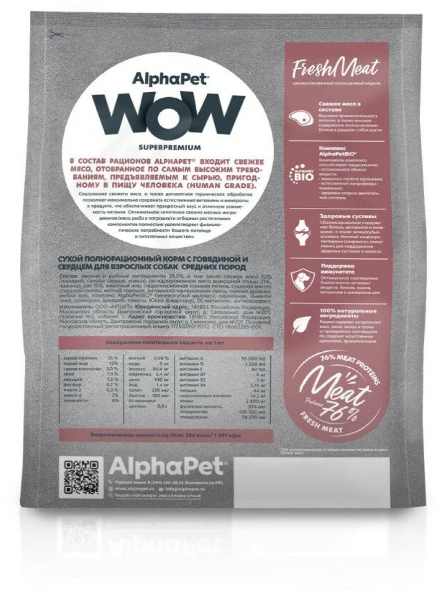Сухой корм AlphaPet WOW для взрослых собак средних пород с говядиной и сердцем 2 кг
