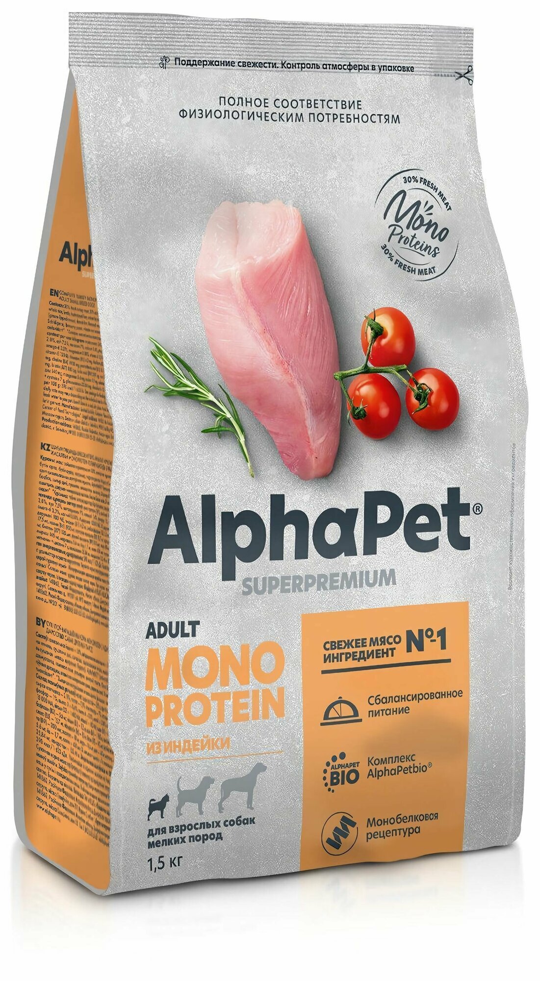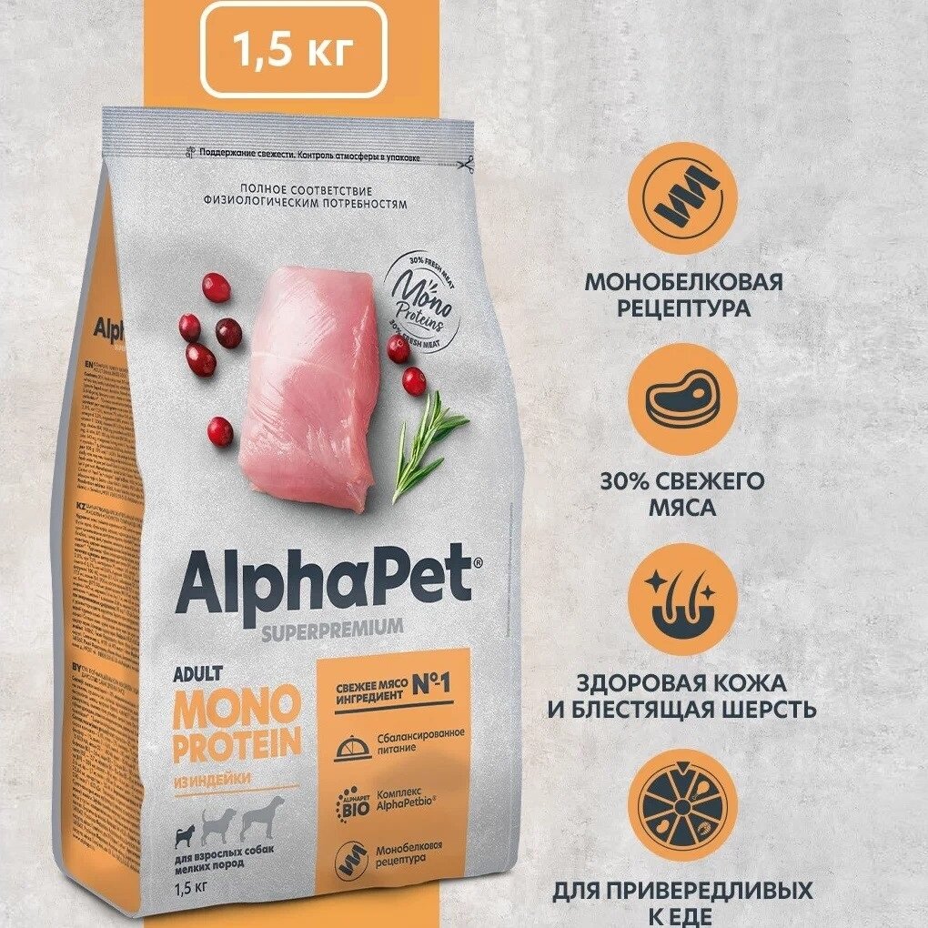 Купить ALPHAPET MONOPROTEIN сухой корм для взрослых собак мелких пород из Индейки 1,5кг