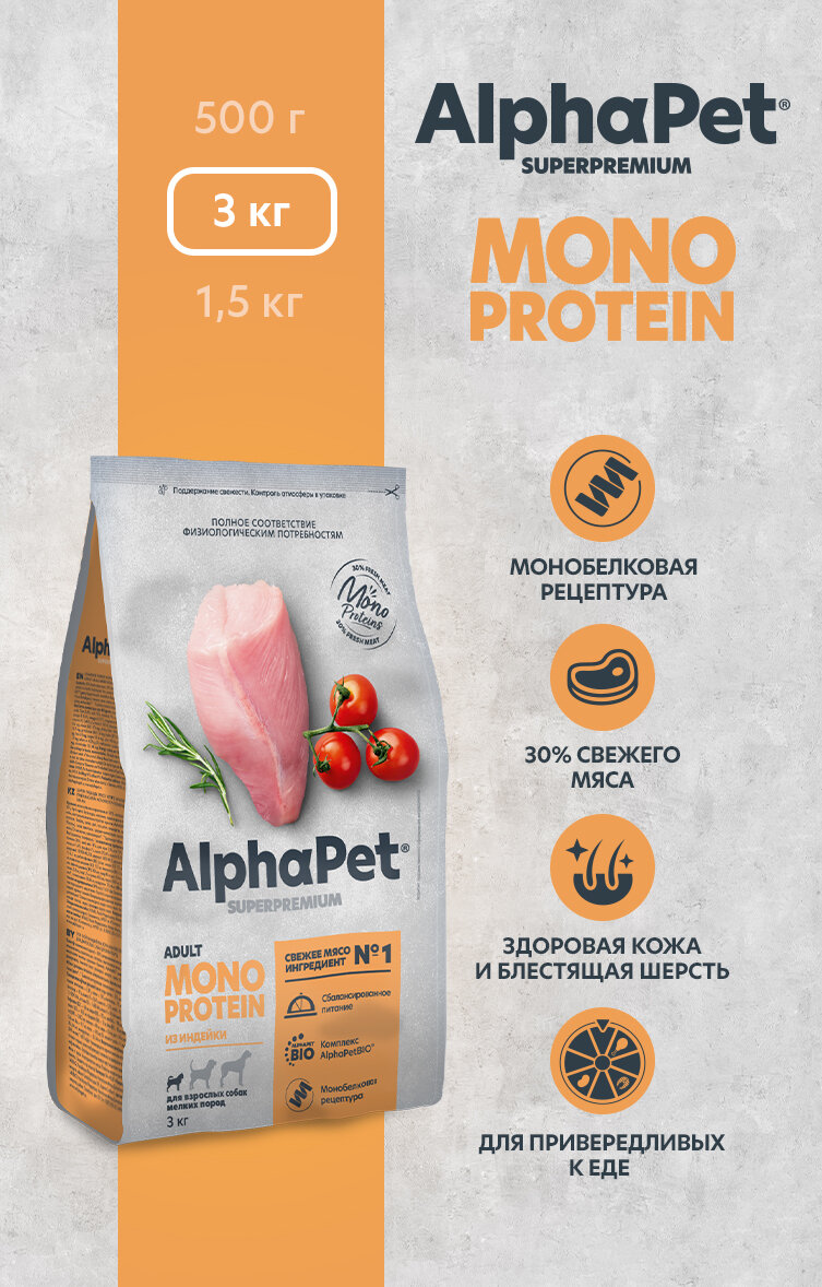Купить AlphaPet MONOPROTEIN сухой корм для взрослых собак мелких пород из Индейки 3кг