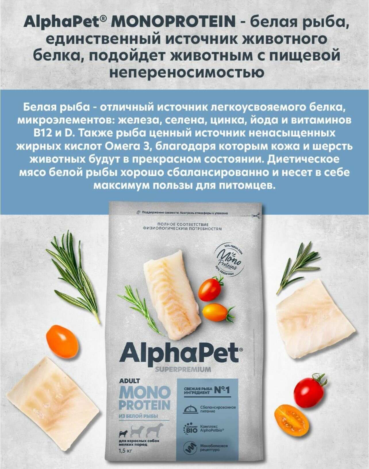 AlphaPet Superpremium Monoprotein 2шт по 1,5кг корм из белой рыбы для собак мелких пород