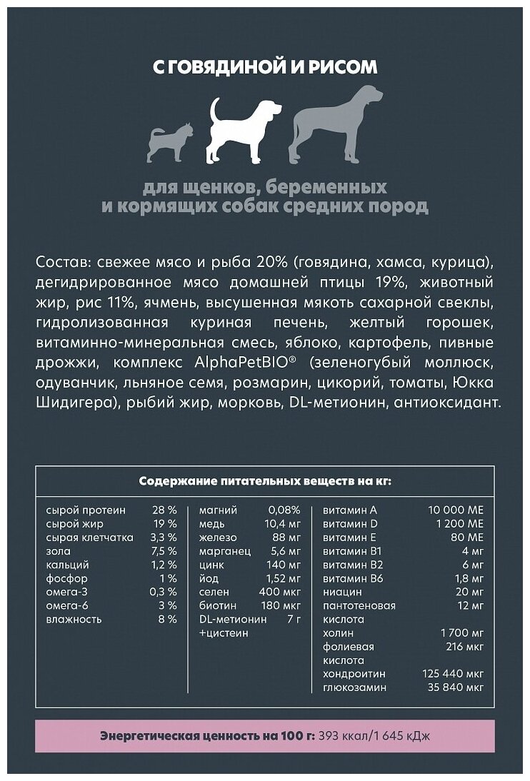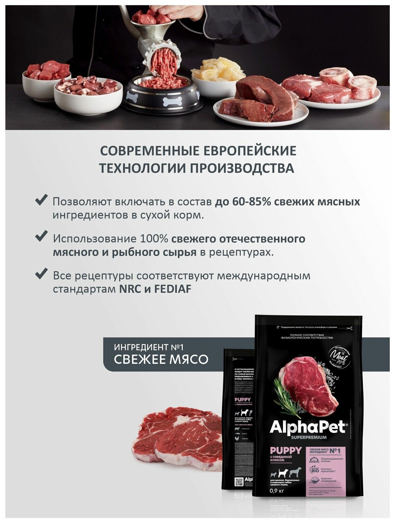Купить Альфа Пет 51607/121209 Superpremium сух.для щенков, беременных и кормящих собак средних пород с Говядиной и рисом 900г