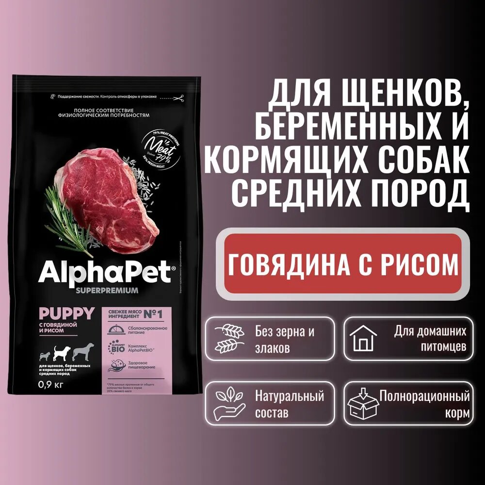 АльфаПет Superpremium Корм для щенков, беременных и кормящих средних пород Говядина и рис 900 гр. (51607)
